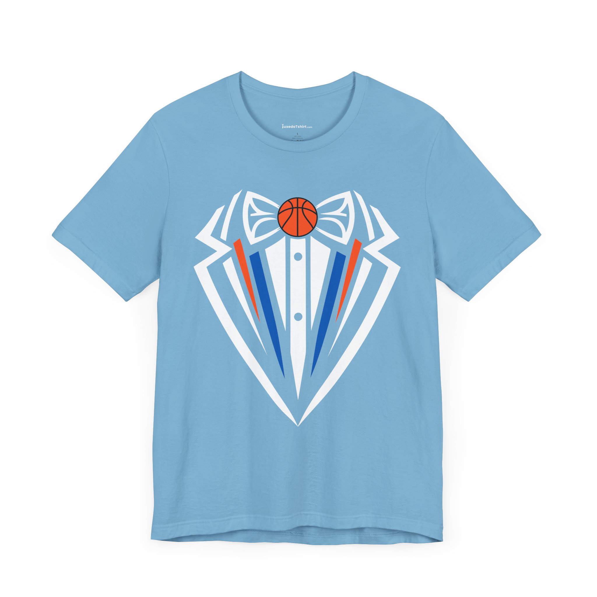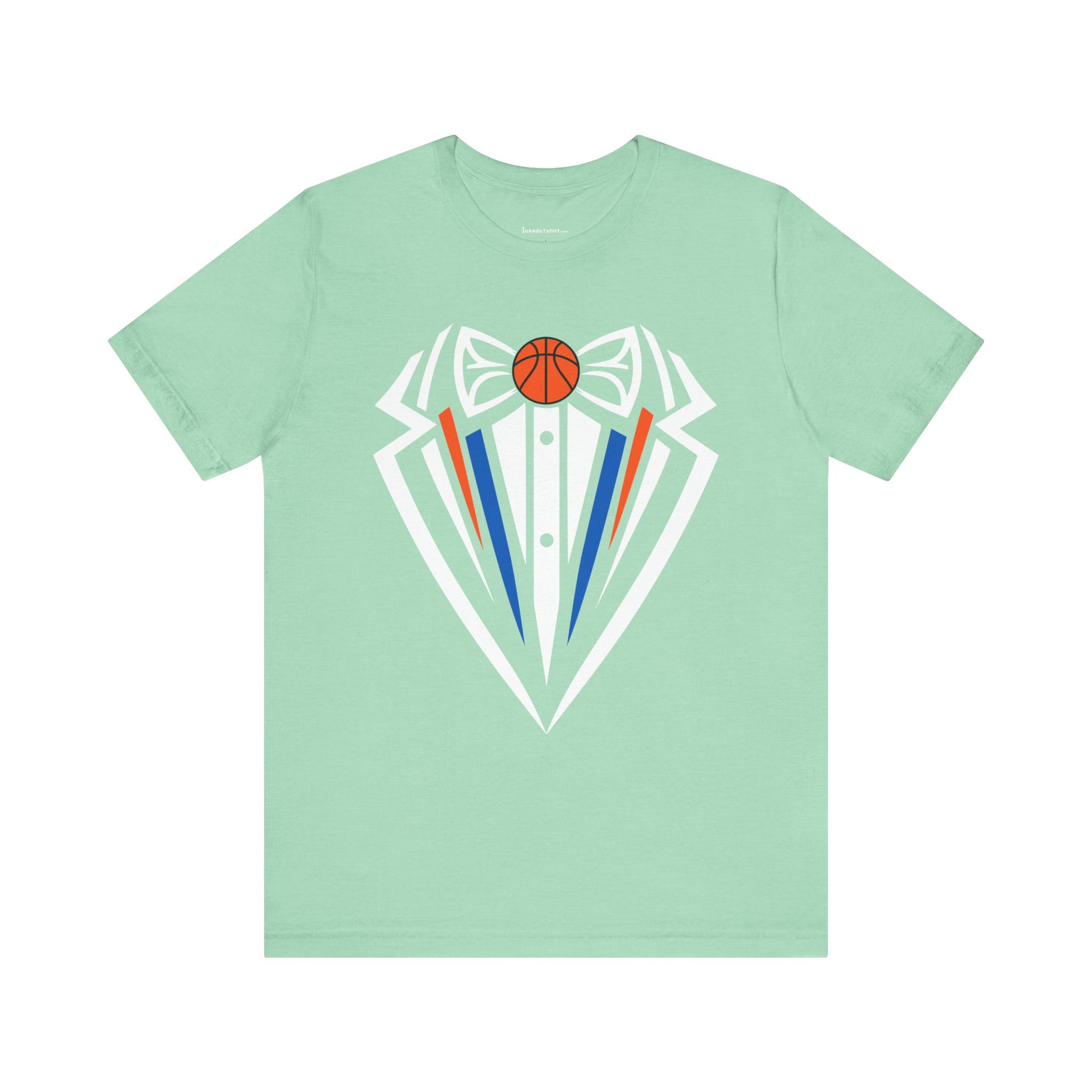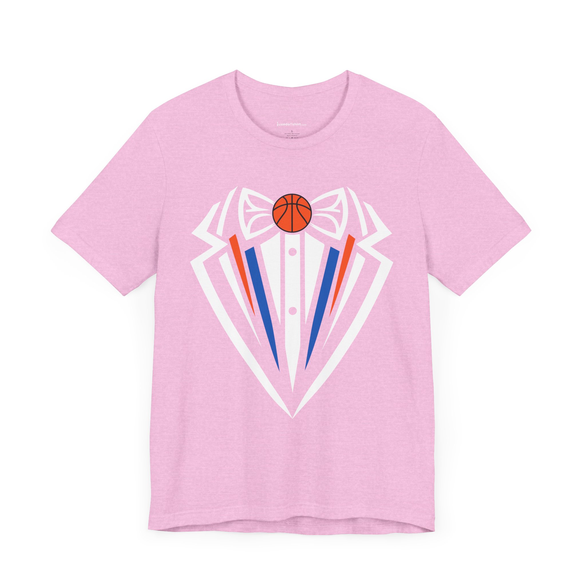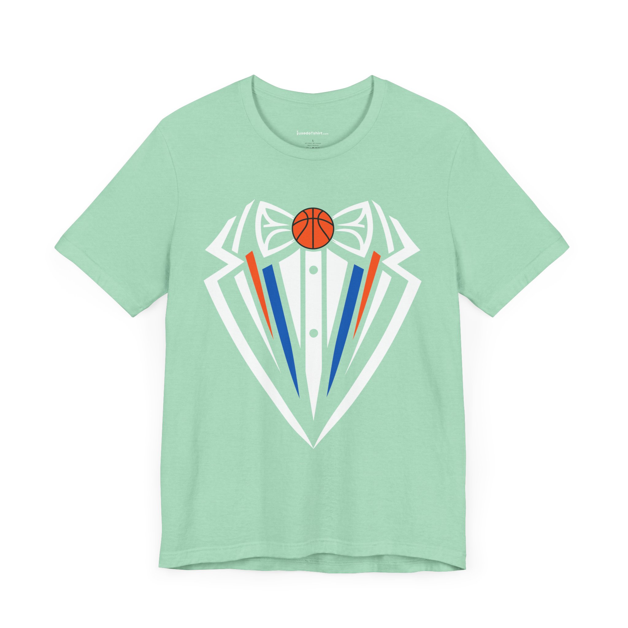 This Basketball Tuxedo T-shirt is perfect for dressing up a basketball game. It gives a fun and stylish vibe, suitable for sports enthusiasts looking to show off their love for basketball. Ideal for adults and can be worn during basketball games, sports events, casual gatherings, and fan parties.