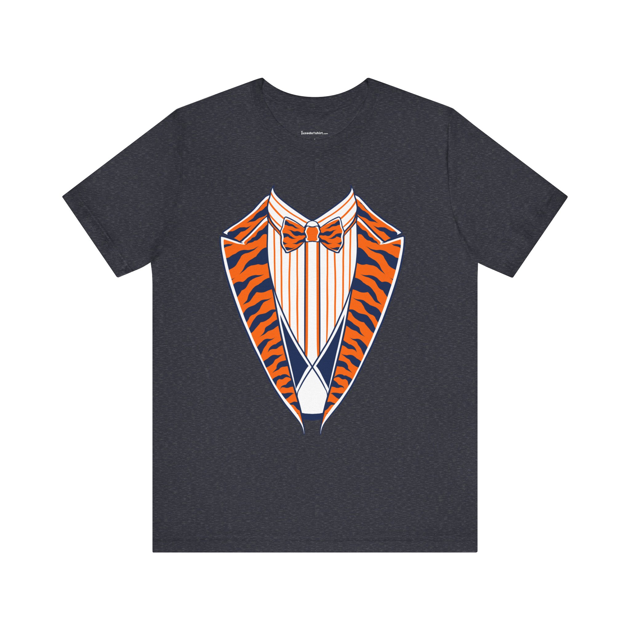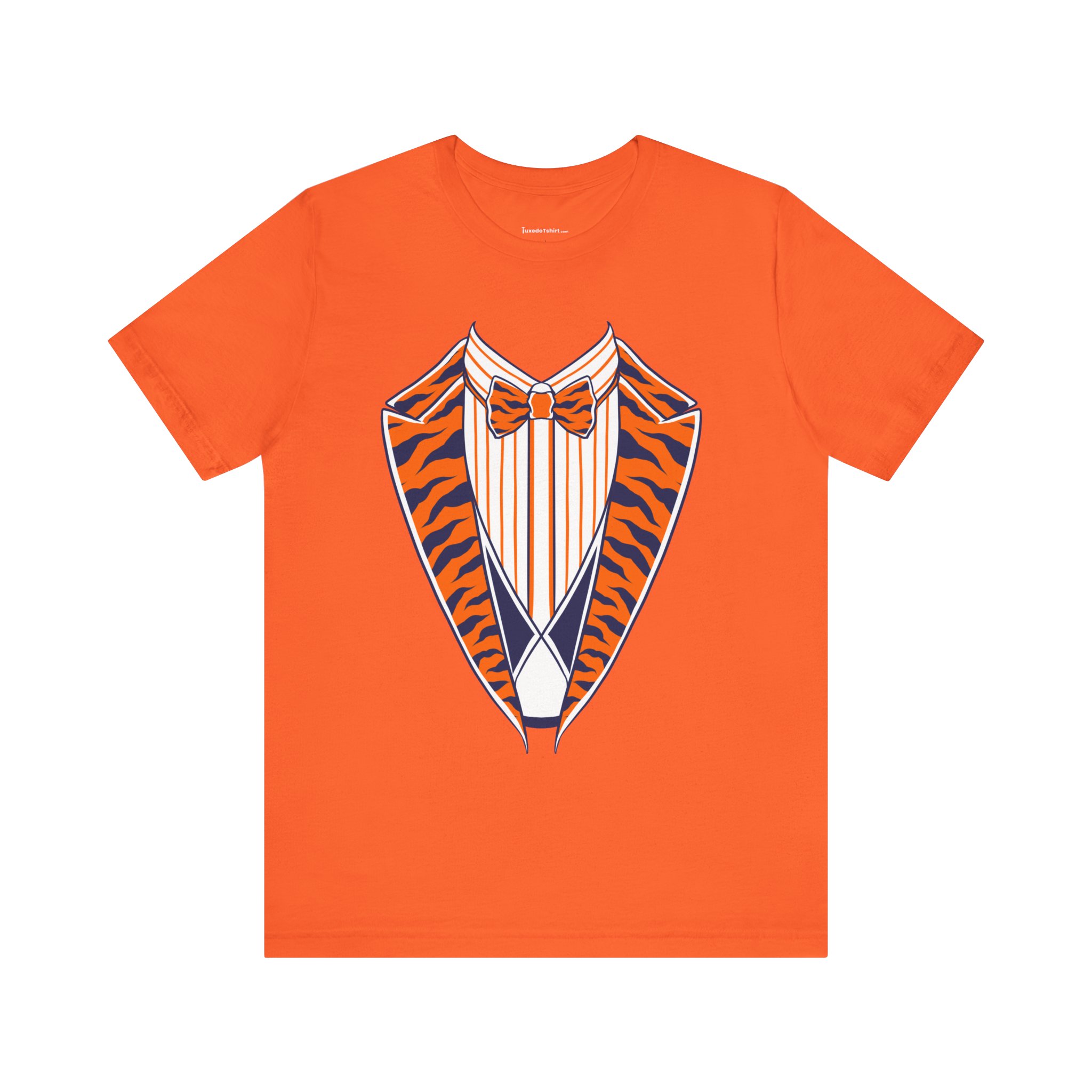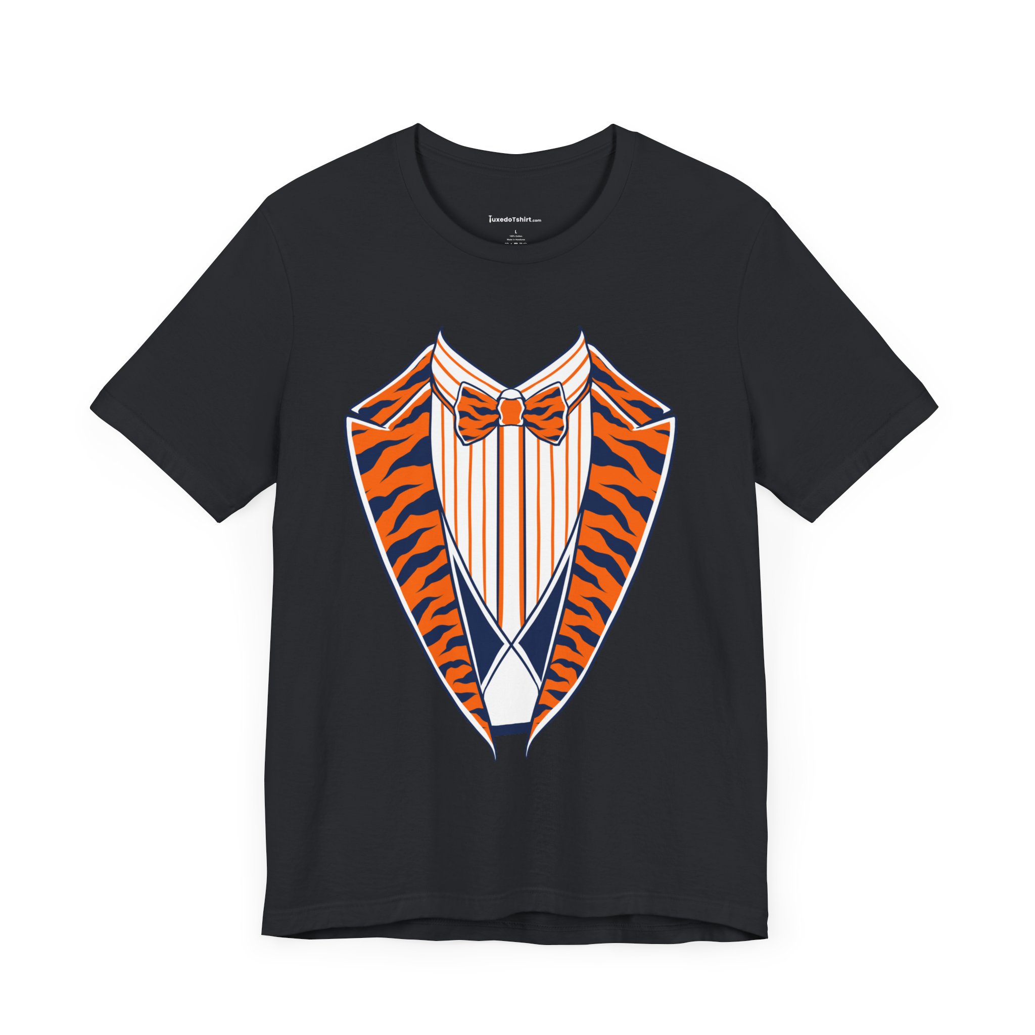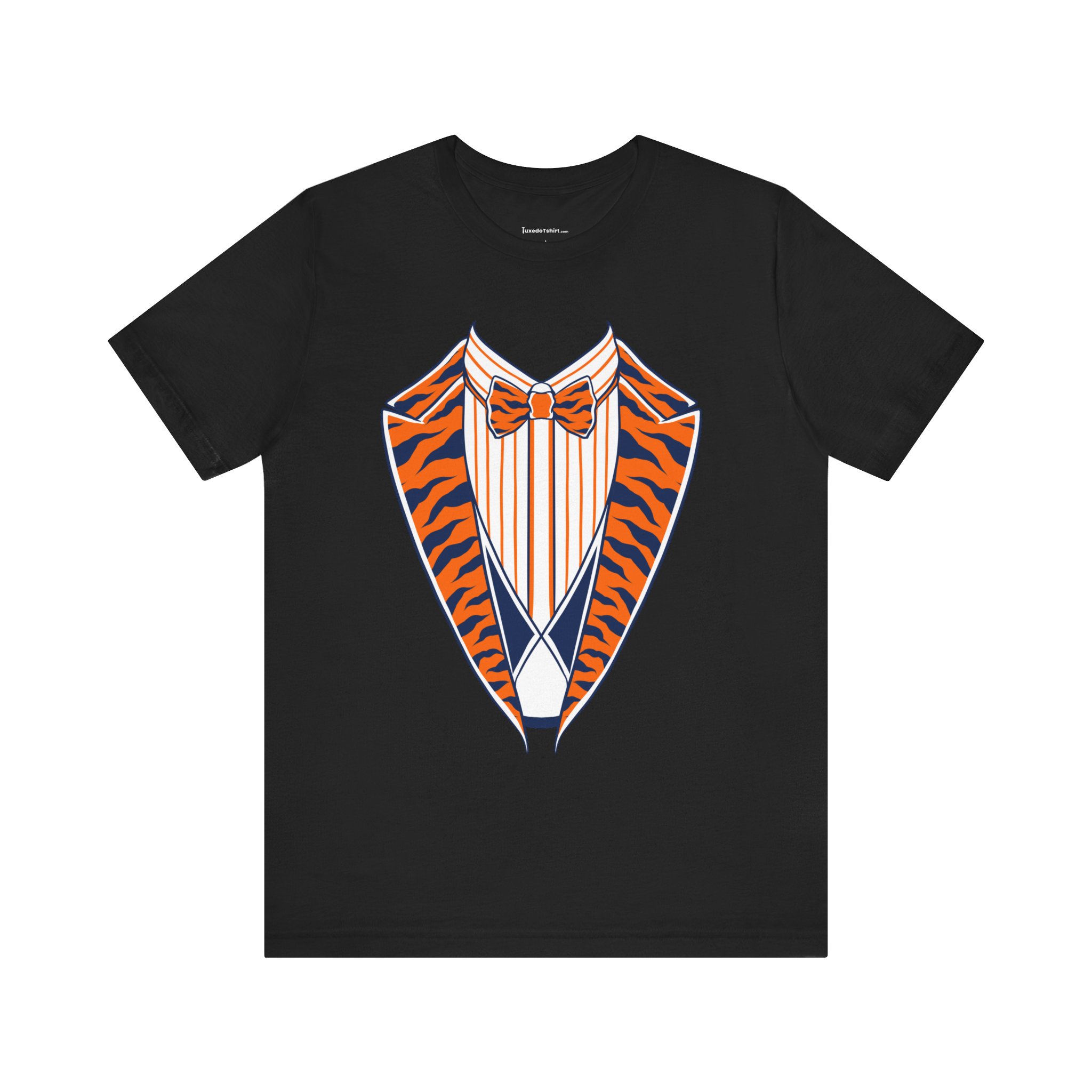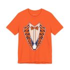 Detroit Baseball Tuxedo TShirt in Navy Blue & Orange. Show your Detroit pride with this fun Motor City novelty tuxedo t-shirt! Perfect for game day downtown, tailgating, or representing Motown anywhere. This faux formal tee features classic navy blue lapels and a matching navy blue bowtie, accented with sharp orange trim and crisp white shirt front details. A great gift for any Detroit baseball fan looking for unique gear. Available on Navy Blue, White, or Orange shirts.