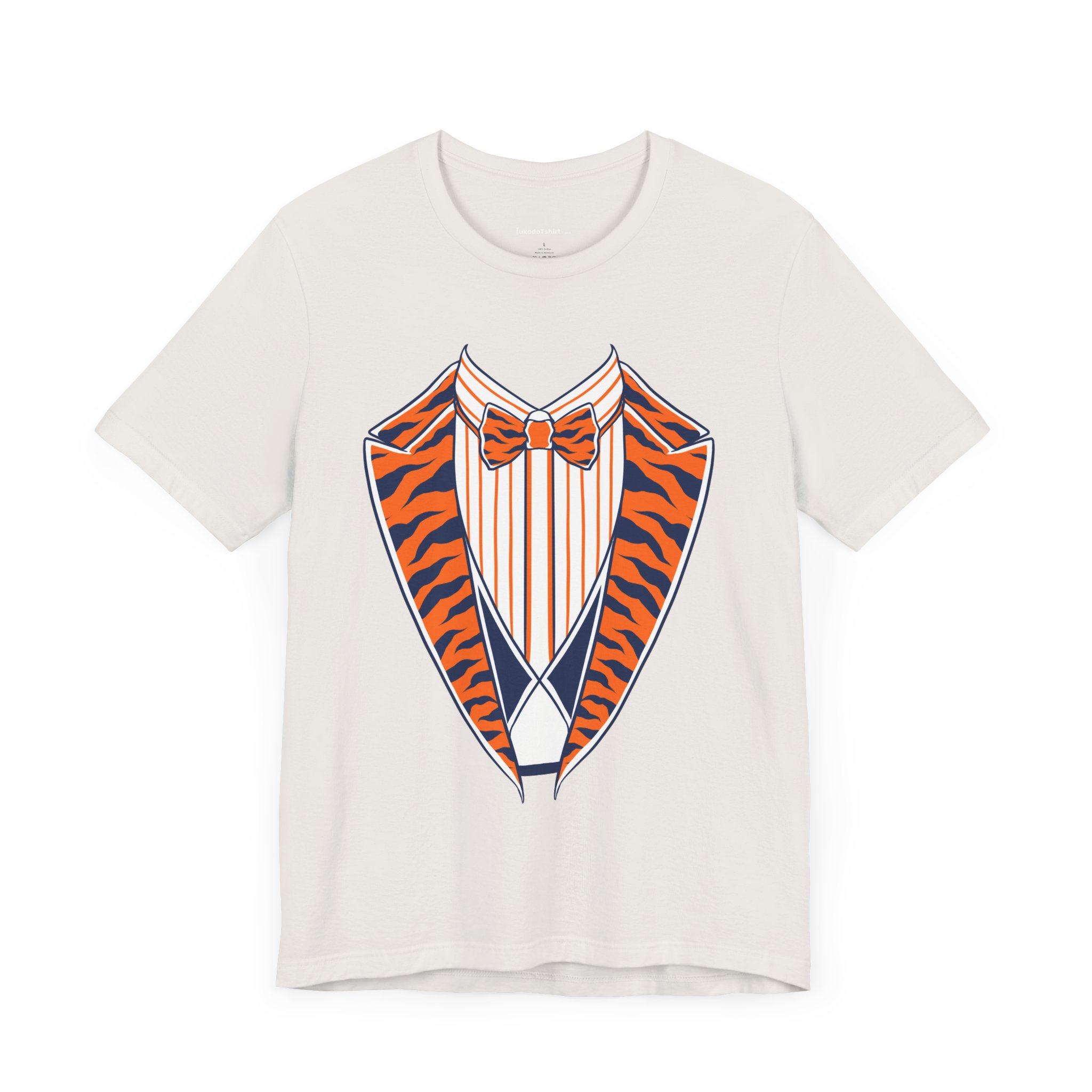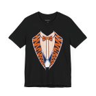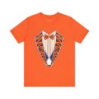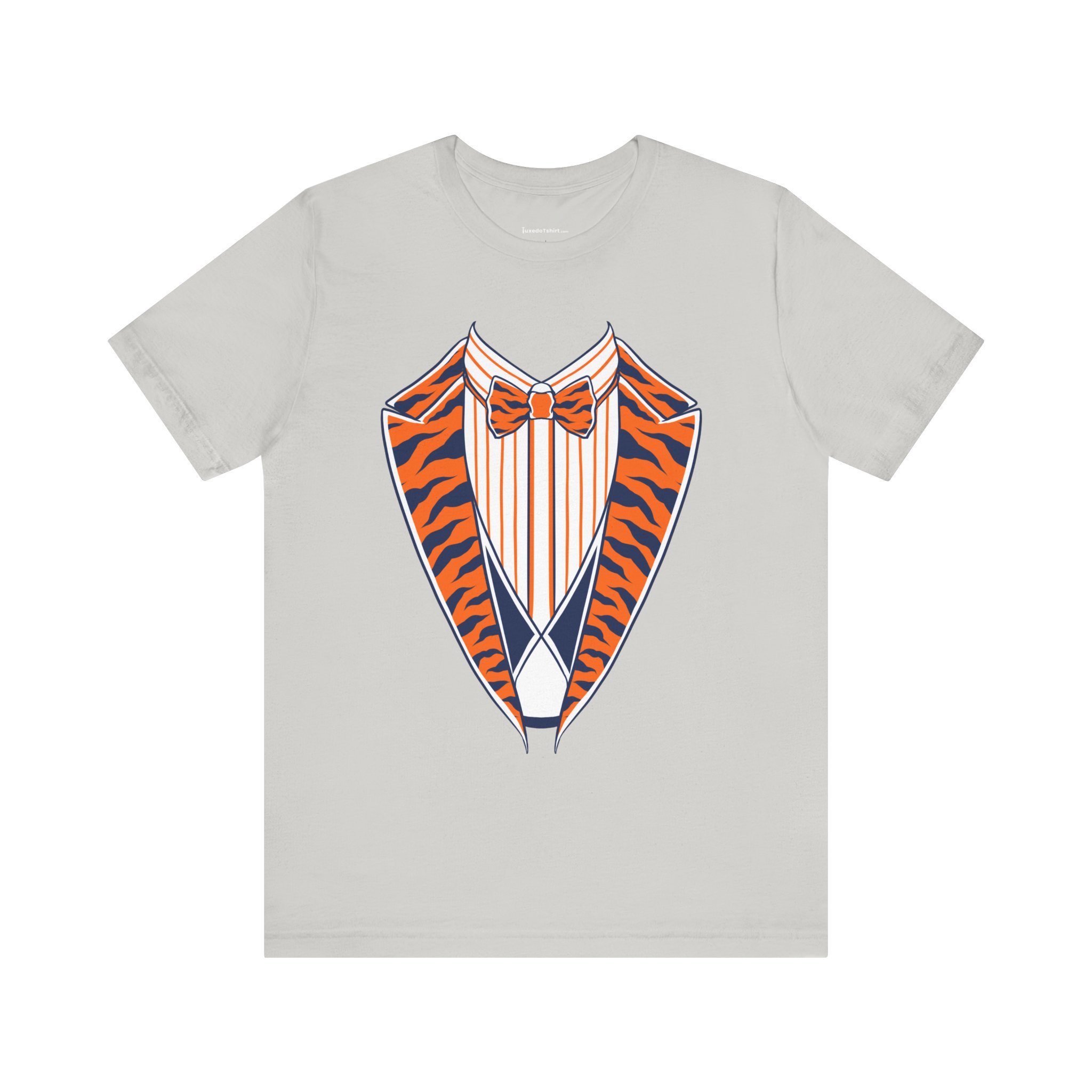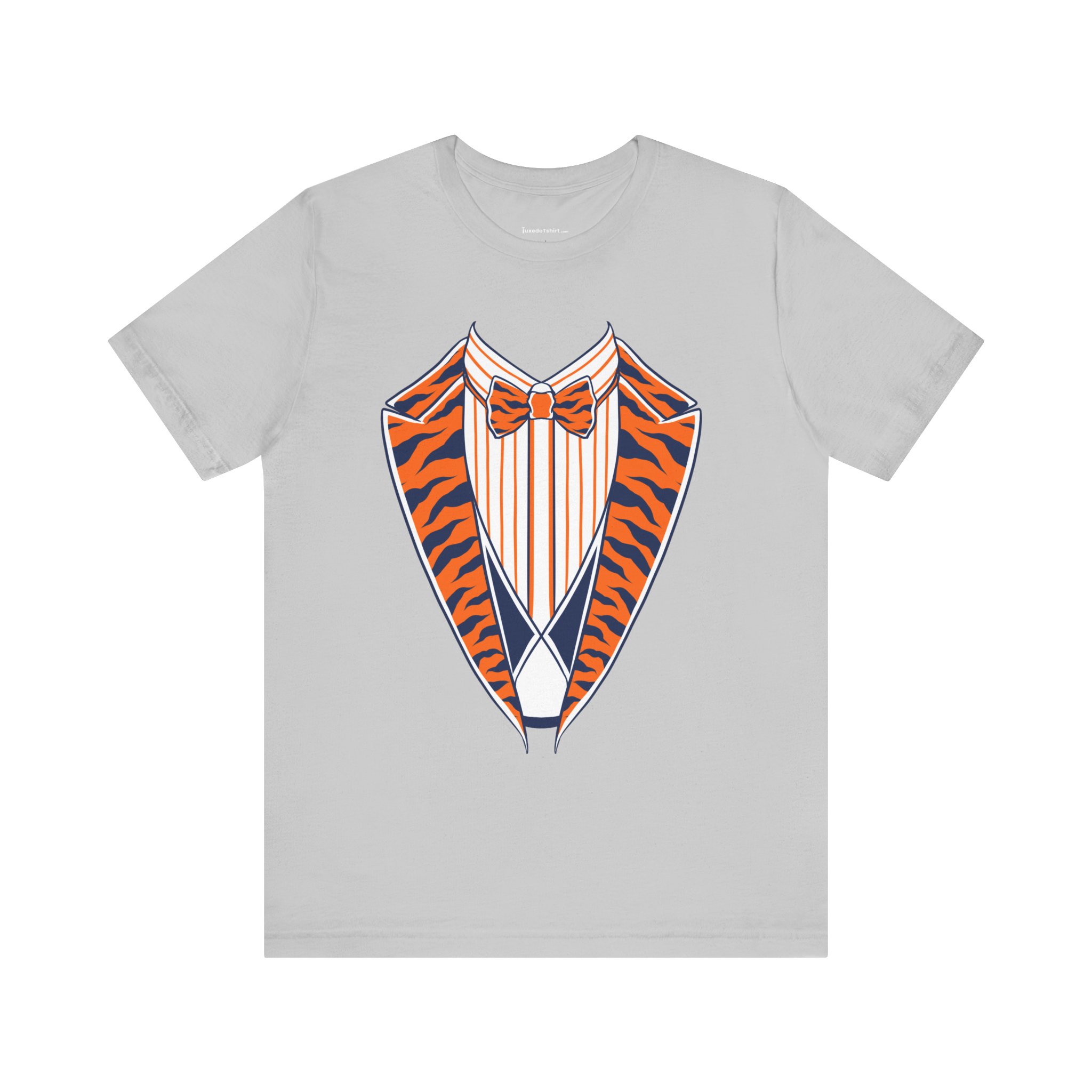 Detroit Baseball Tuxedo TShirt in Navy Blue & Orange. Show your Detroit pride with this fun Motor City novelty tuxedo t-shirt! Perfect for game day downtown, tailgating, or representing Motown anywhere. This faux formal tee features classic navy blue lapels and a matching navy blue bowtie, accented with sharp orange trim and crisp white shirt front details. A great gift for any Detroit baseball fan looking for unique gear. Available on Navy Blue, White, or Orange shirts.