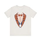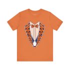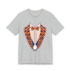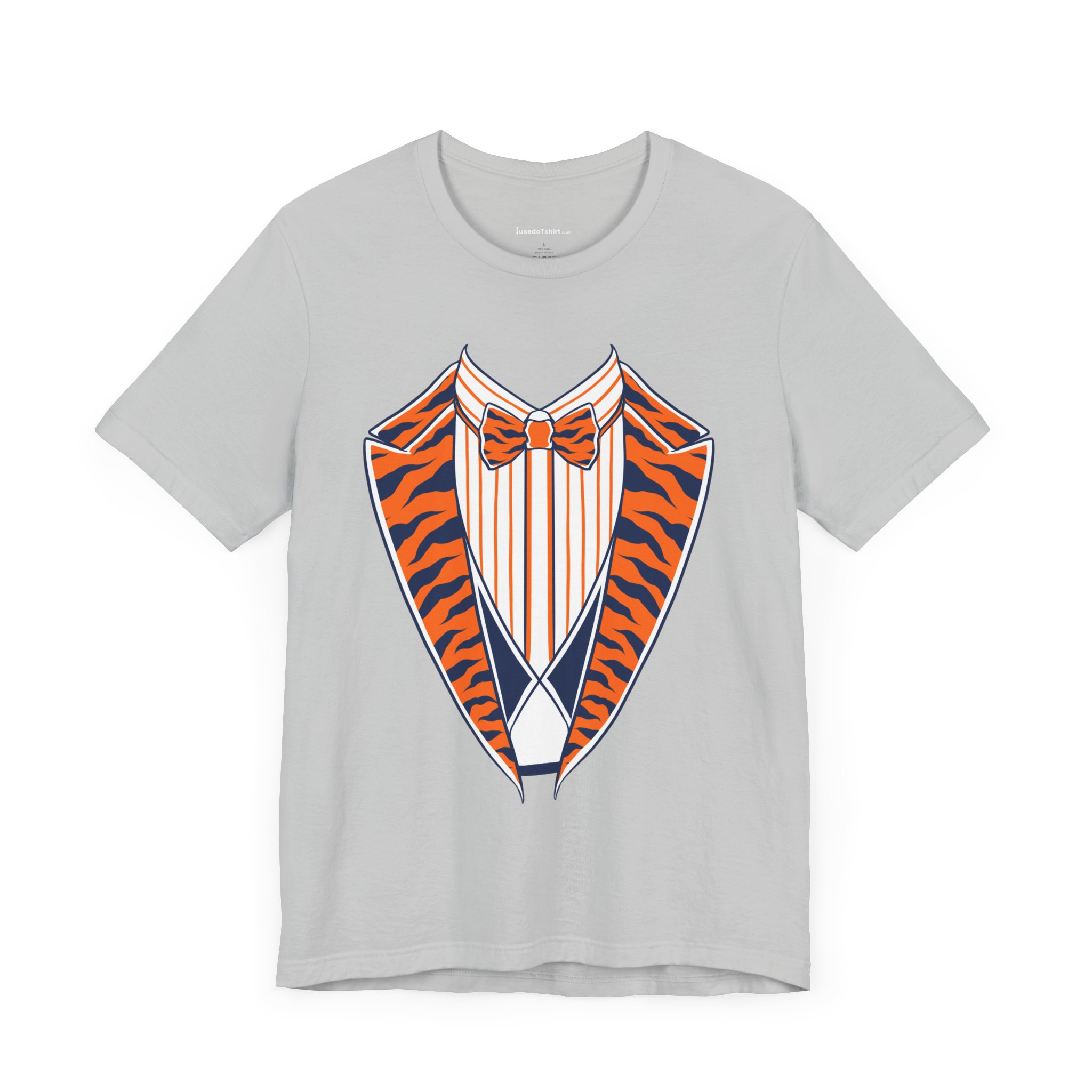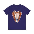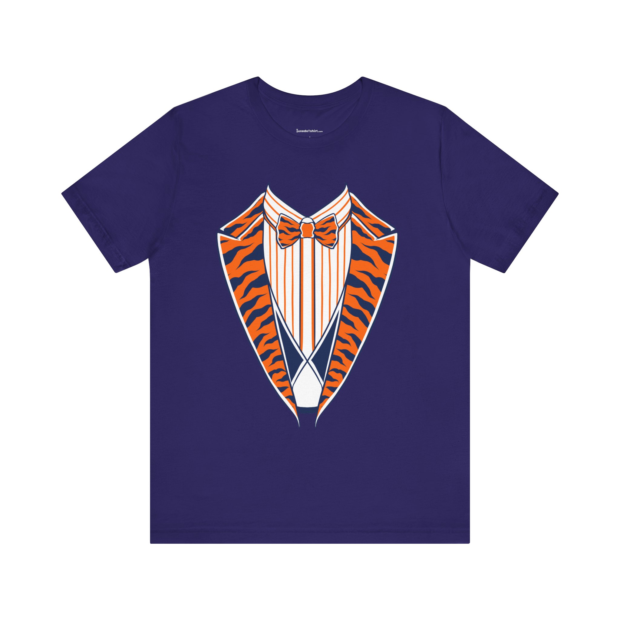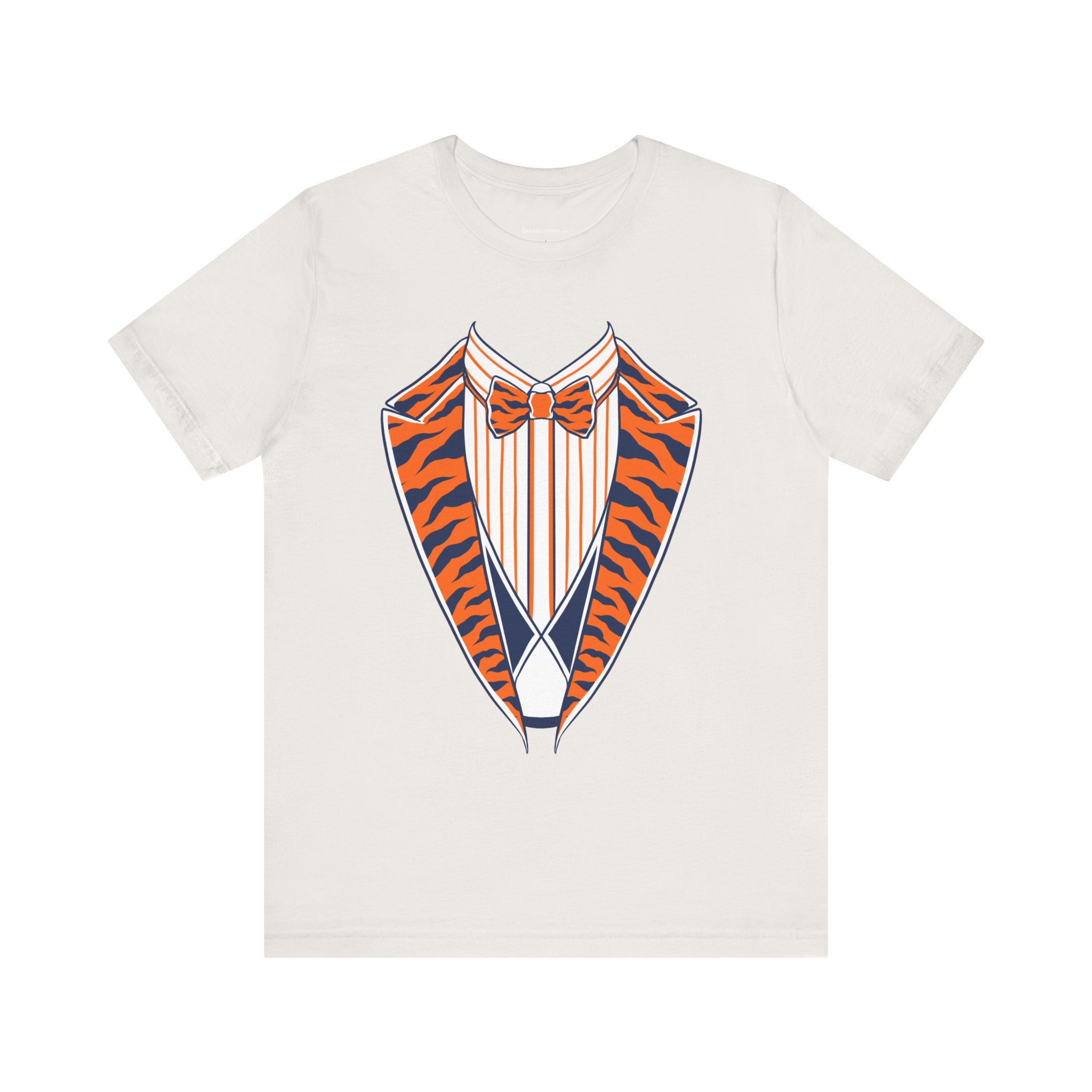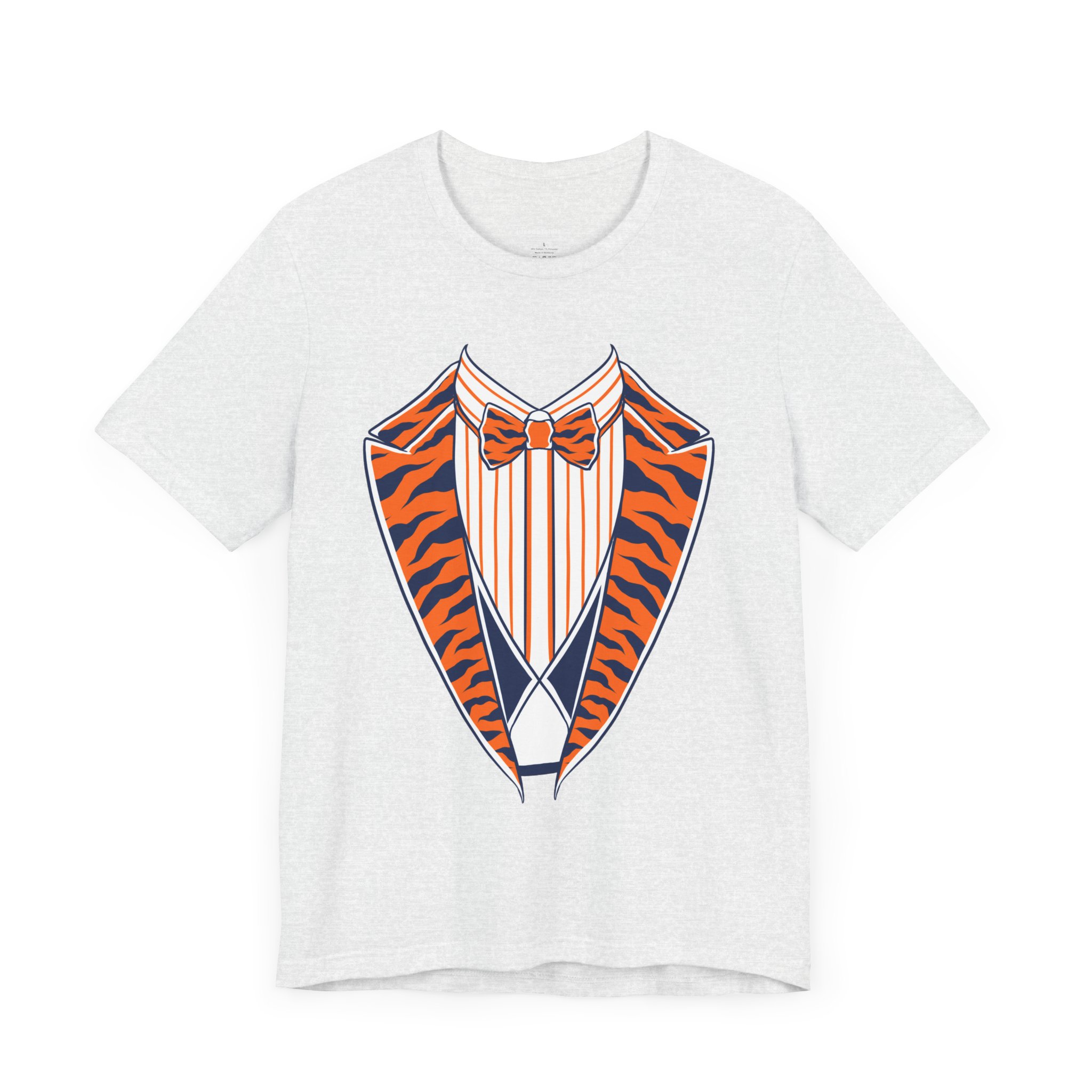Detroit Baseball Tuxedo TShirt in Navy Blue & Orange. Show your Detroit pride with this fun Motor City novelty tuxedo t-shirt! Perfect for game day downtown, tailgating, or representing Motown anywhere. This faux formal tee features classic navy blue lapels and a matching navy blue bowtie, accented with sharp orange trim and crisp white shirt front details. A great gift for any Detroit baseball fan looking for unique gear. Available on Navy Blue, White, or Orange shirts.