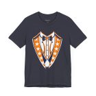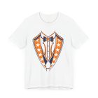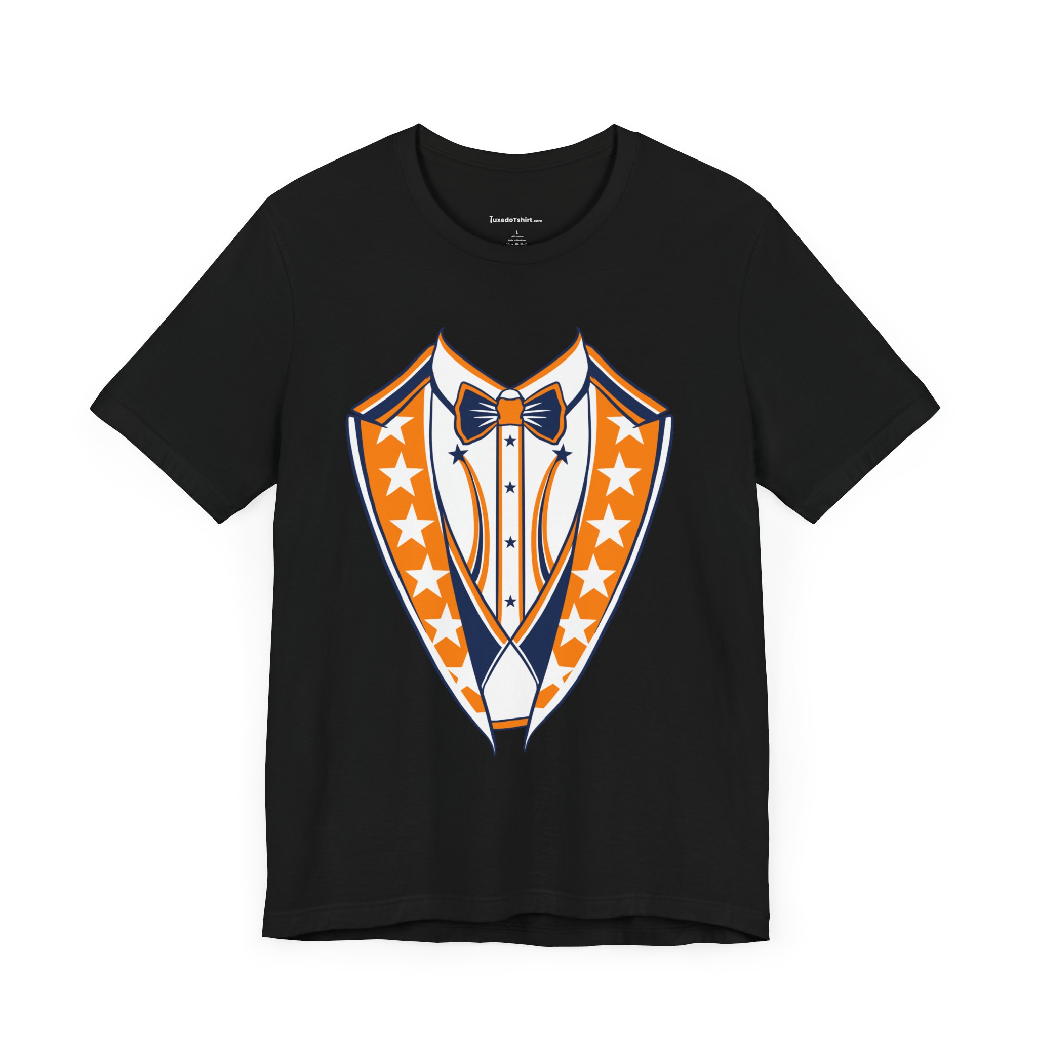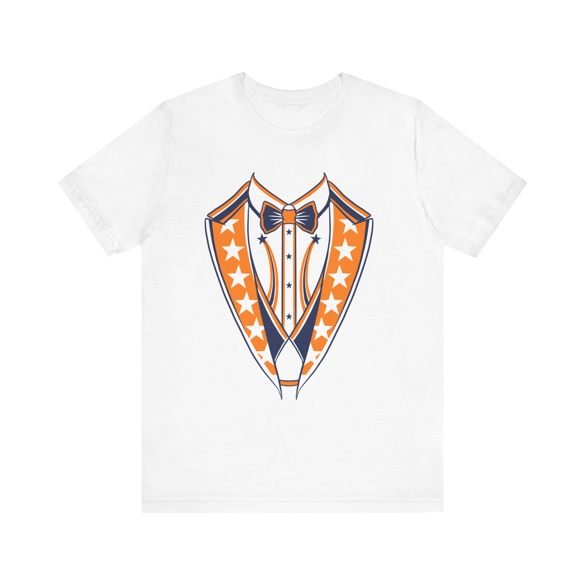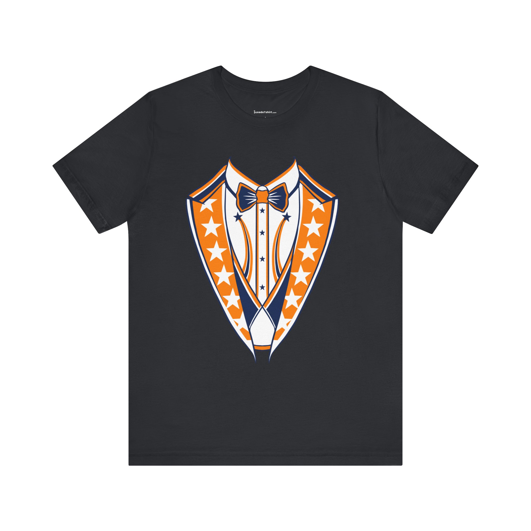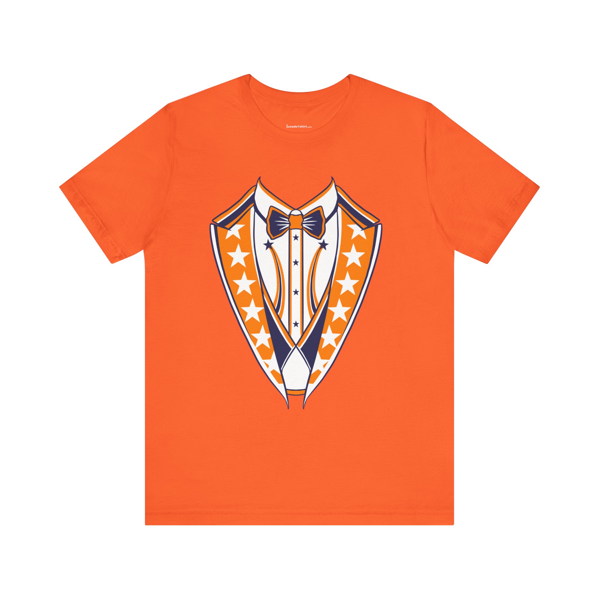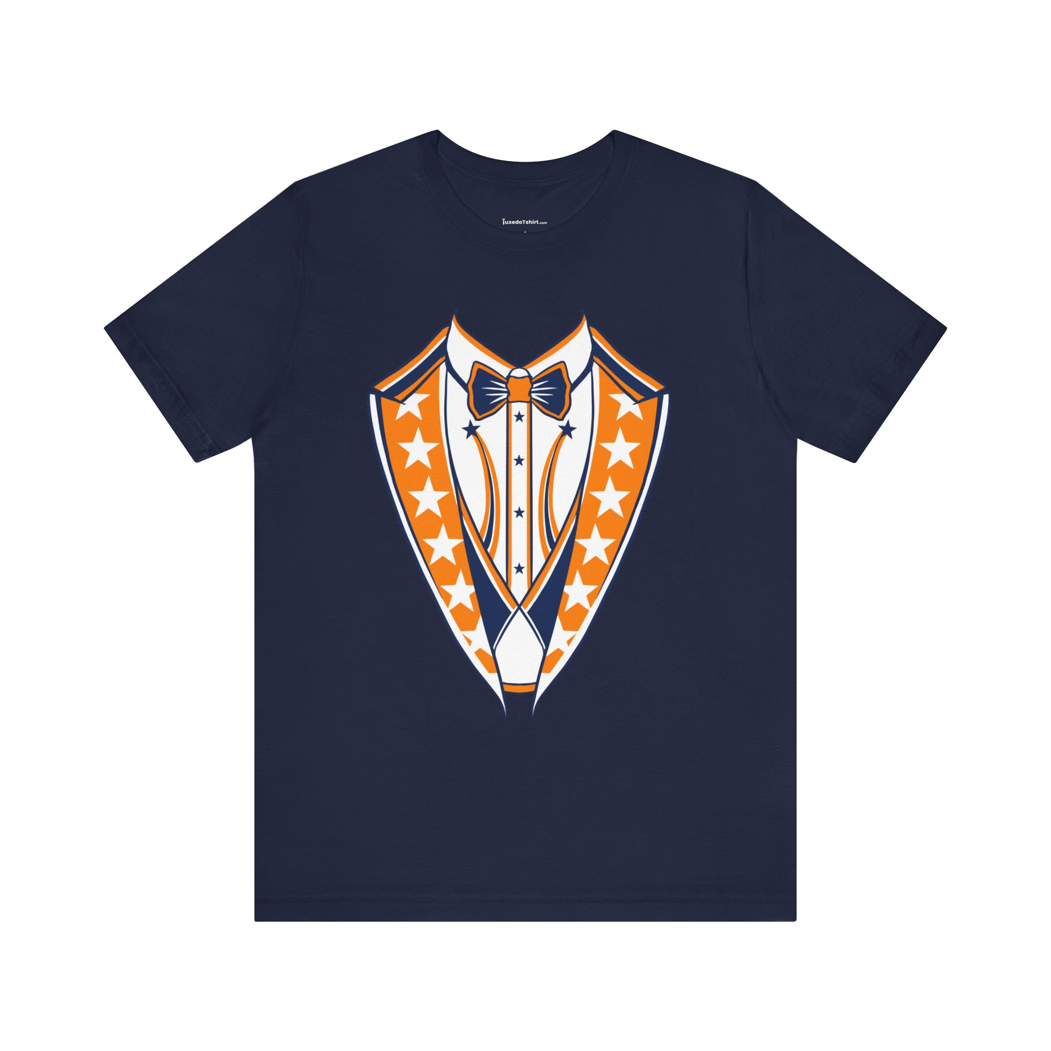 Houston Baseball Tuxedo TShirt in Navy Blue & Orange. Show your Houston baseball pride with this unique tuxedo t-shirt! Designed for the ultimate fan, this tee features classy navy blue lapels and a bright orange bowtie with matching accents against a crisp white shirt front, capturing the spirit of H-Town baseball. Perfect for wearing to the ballpark, tailgate parties, or just showing off your Space City spirit around town. A great novelty gift for any Houston sports enthusiast. Available on Navy Blue, White, or Orange shirts.