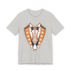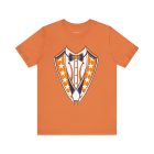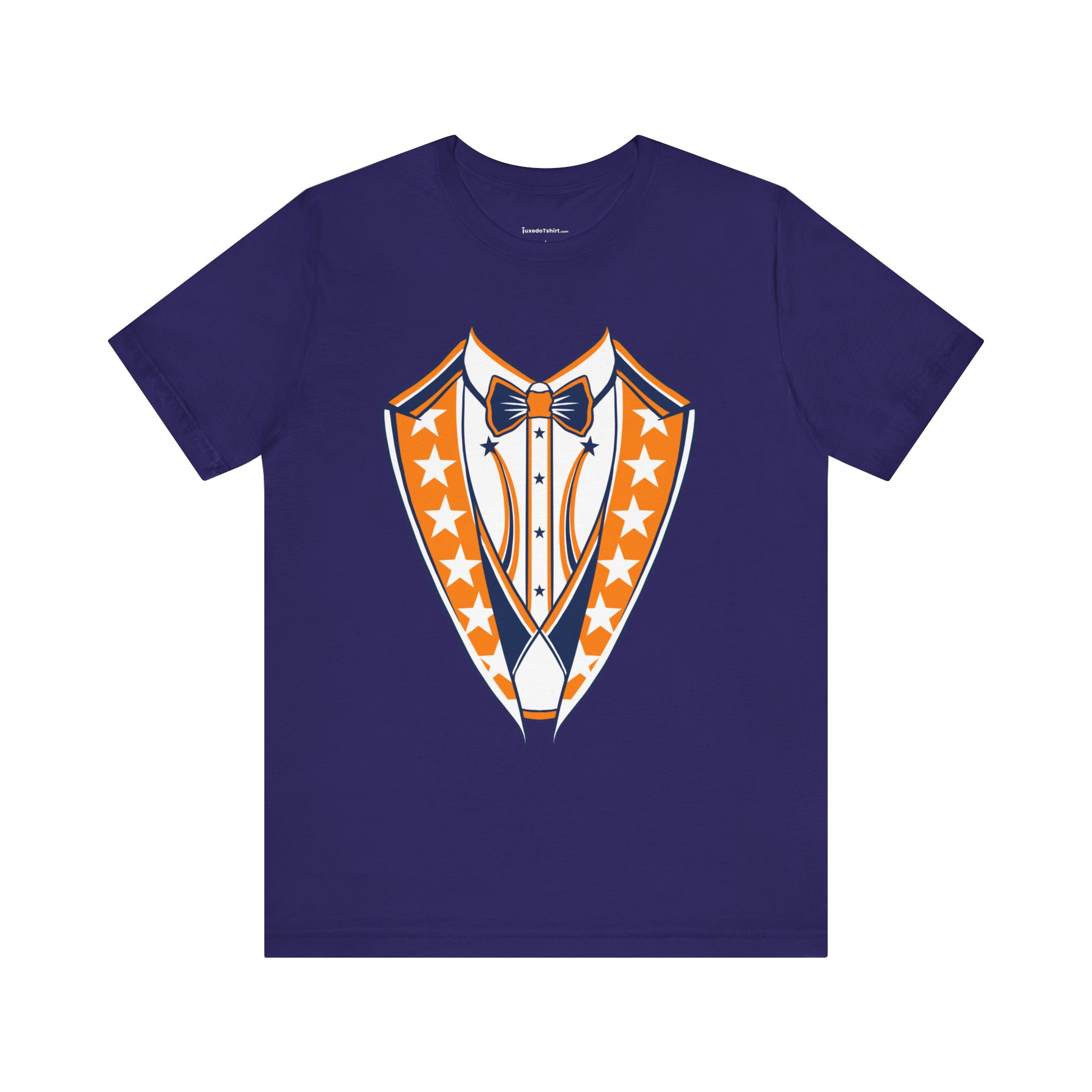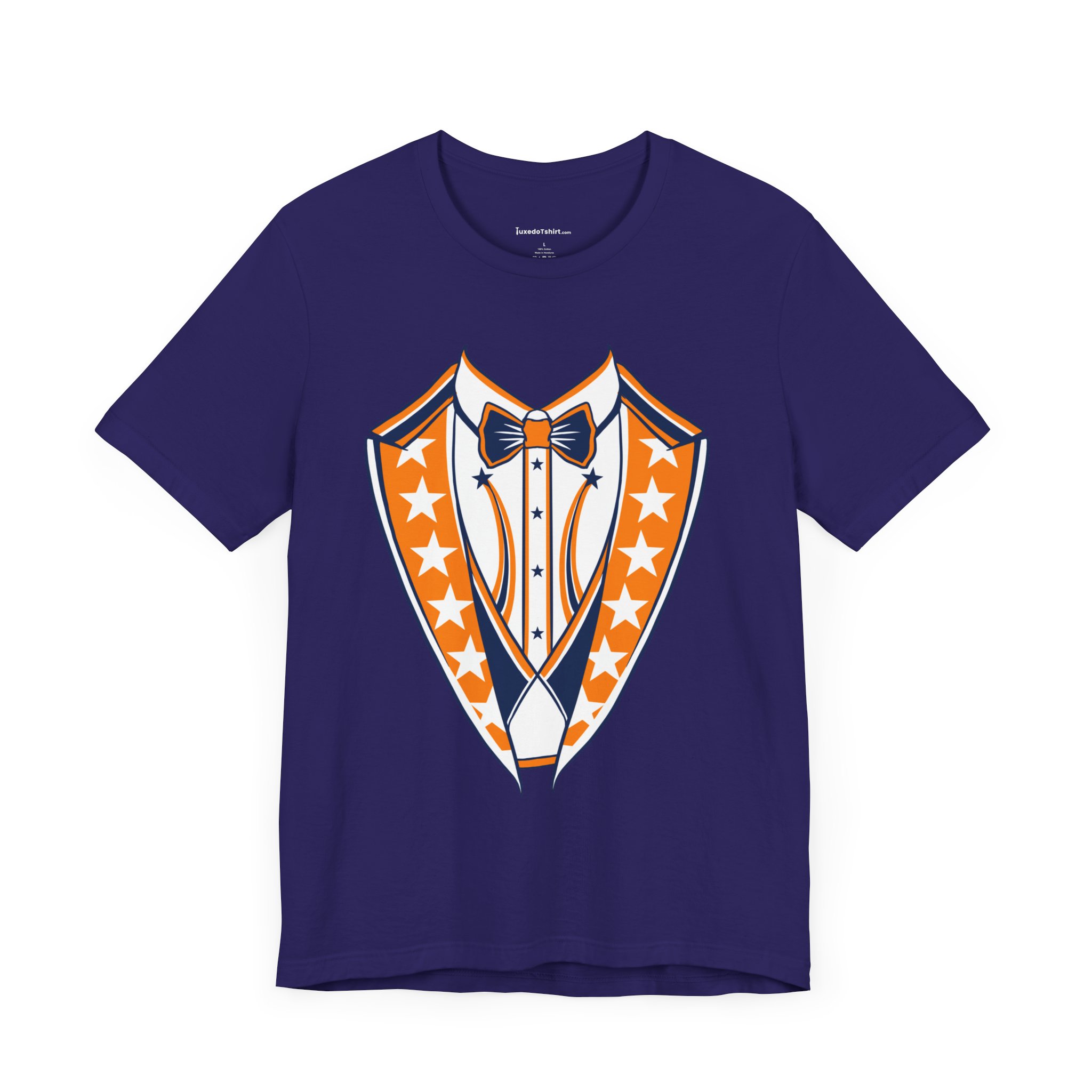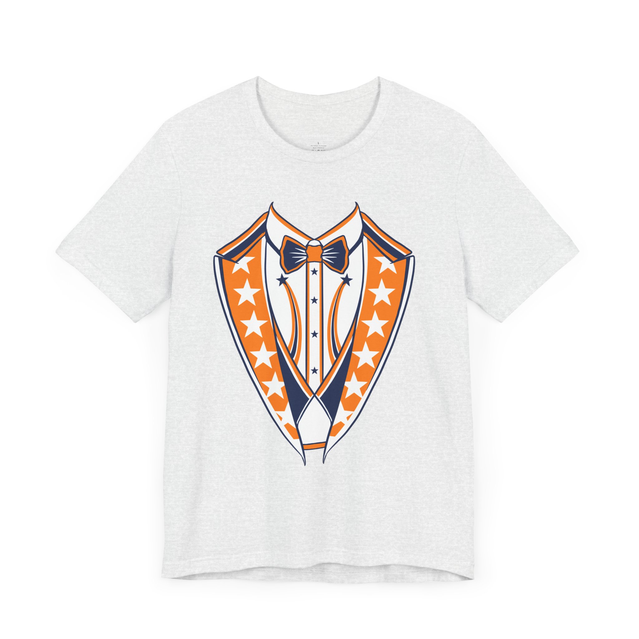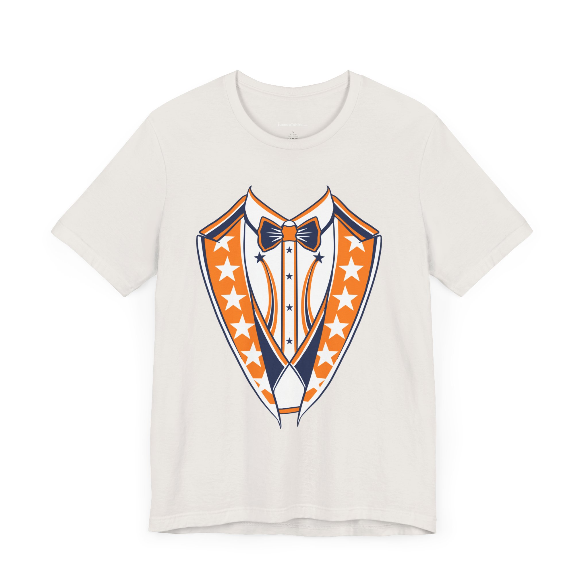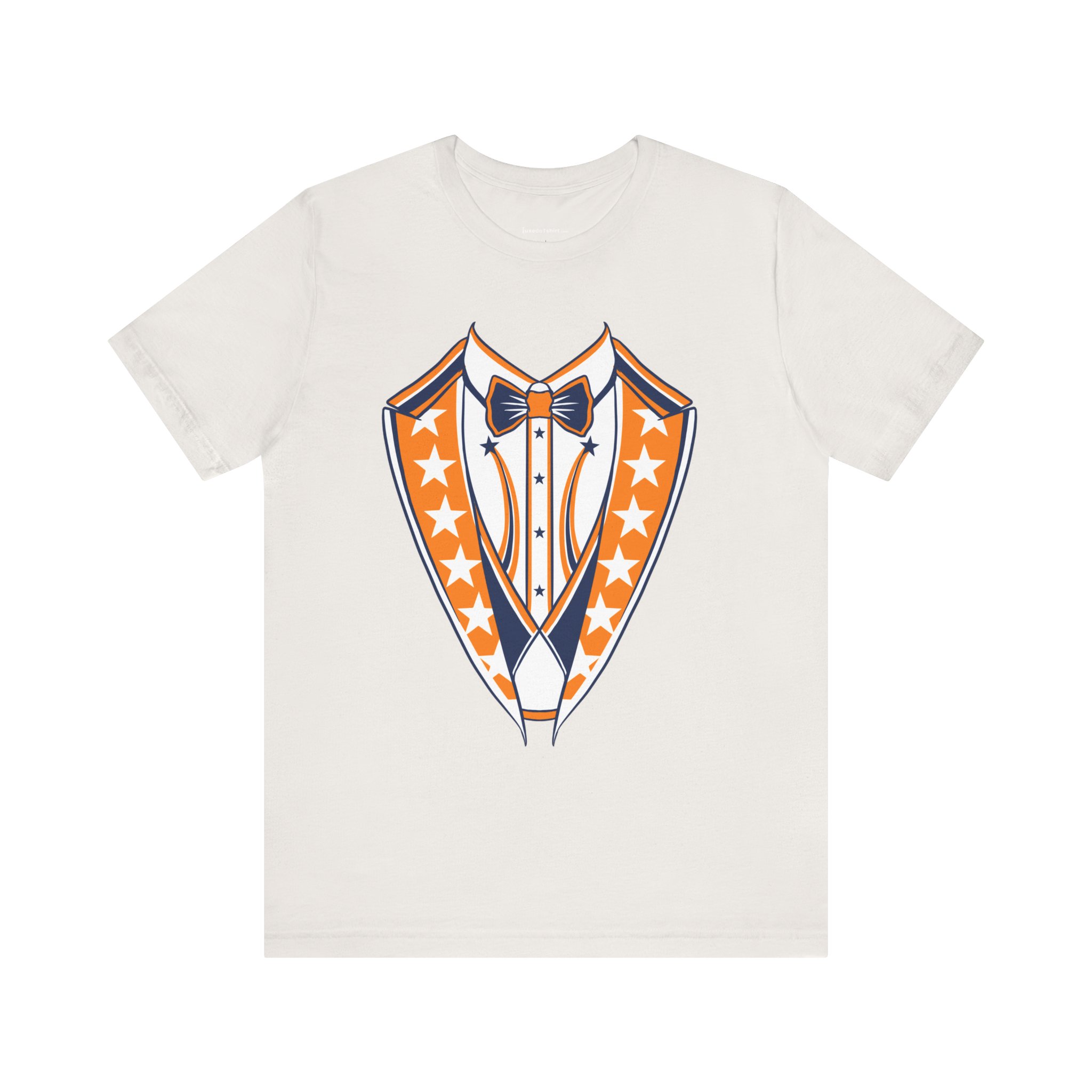 Houston Baseball Tuxedo TShirt in Navy Blue & Orange. Show your Houston baseball pride with this unique tuxedo t-shirt! Designed for the ultimate fan, this tee features classy navy blue lapels and a bright orange bowtie with matching accents against a crisp white shirt front, capturing the spirit of H-Town baseball. Perfect for wearing to the ballpark, tailgate parties, or just showing off your Space City spirit around town. A great novelty gift for any Houston sports enthusiast. Available on Navy Blue, White, or Orange shirts.