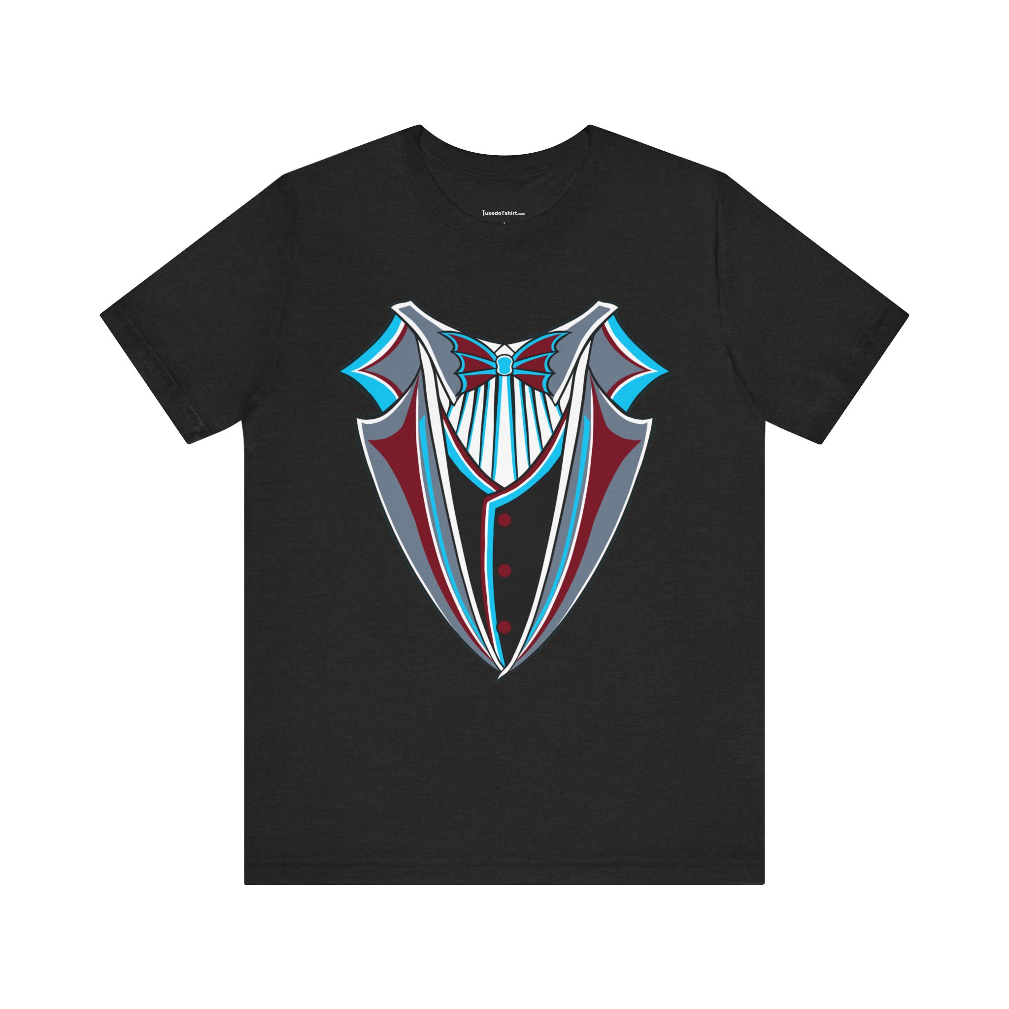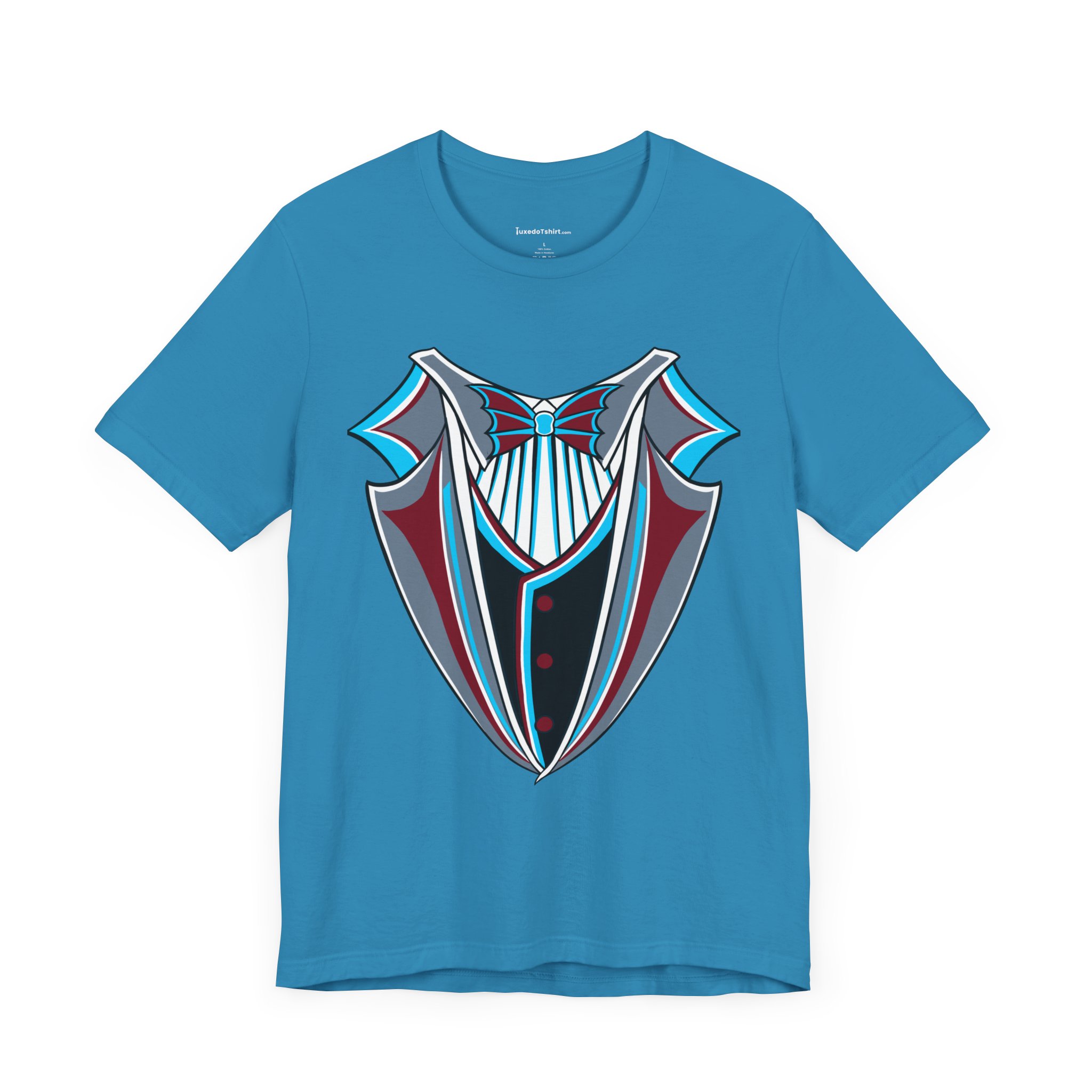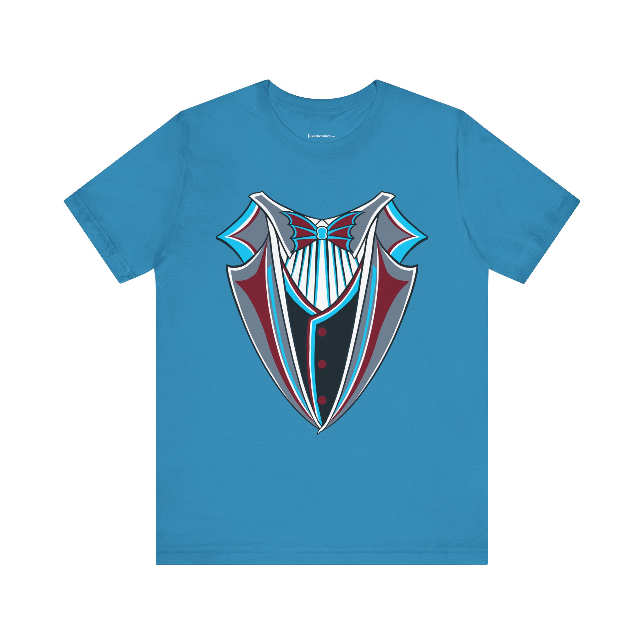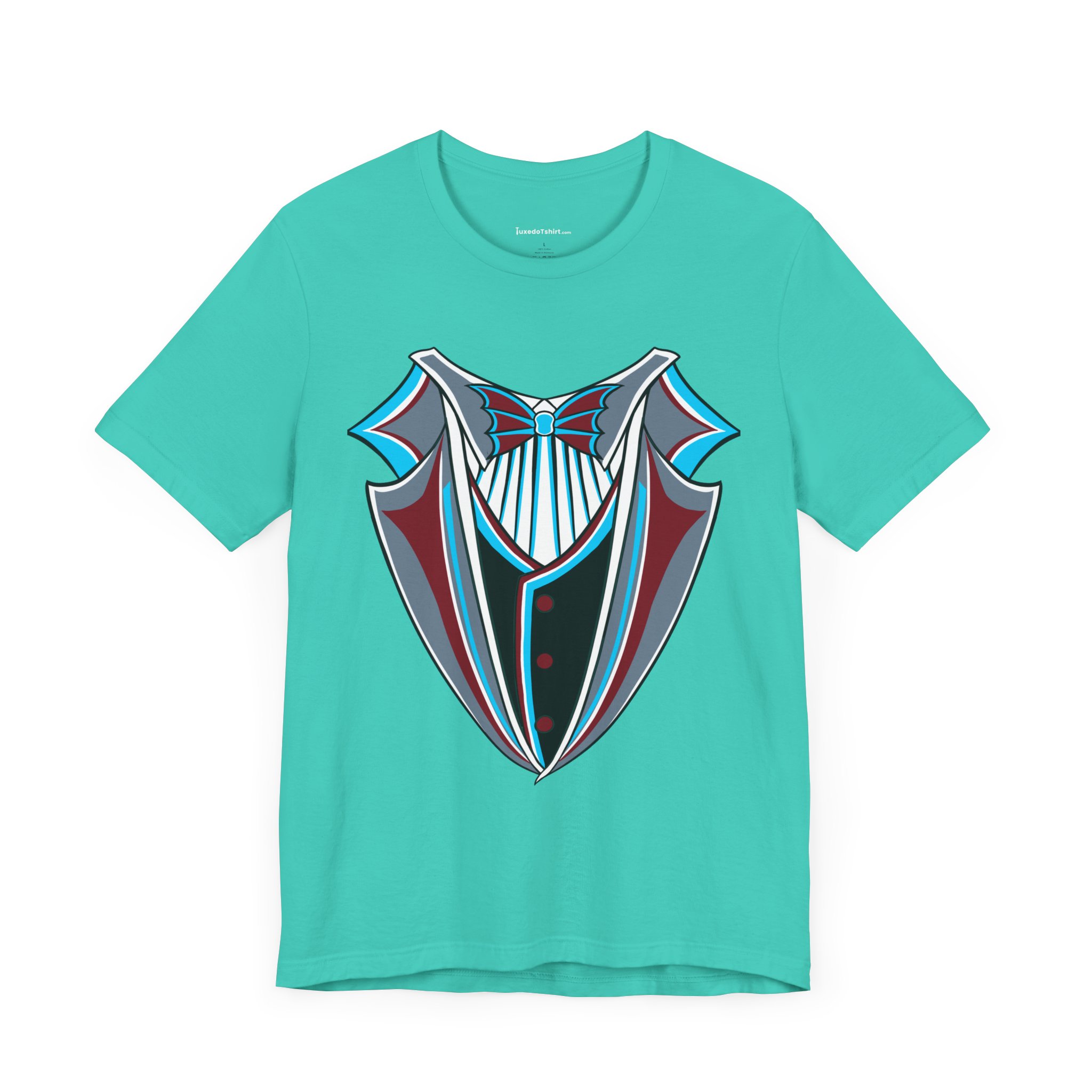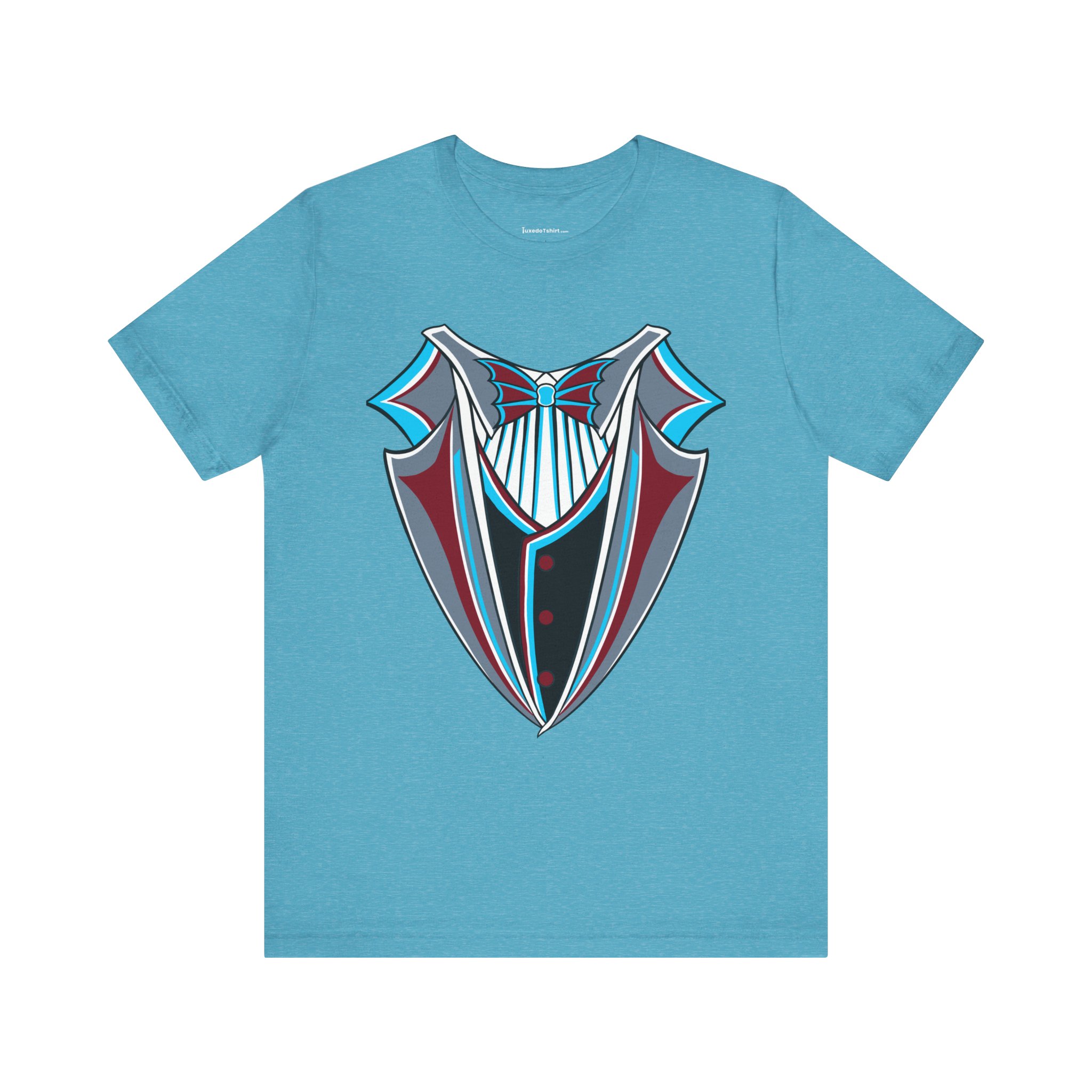 Miami Baseball Tuxedo TShirt in Miami Blue & Black. Bring the South Florida vibe with this Magic City novelty tuxedo tee! Perfect for game day in Miami, tailgating, or showing your SoFla baseball spirit. Features sleek black lapels trimmed with vibrant Miami Blue (teal/aqua), a striking Caliente Red bowtie, and cool slate gray details on the crisp white shirt front. A great gift for any Miami baseball fan looking for unique, fun fan gear with tropical flair. Available on Black, White, or Miami Blue (teal/aqua) t-shirts.