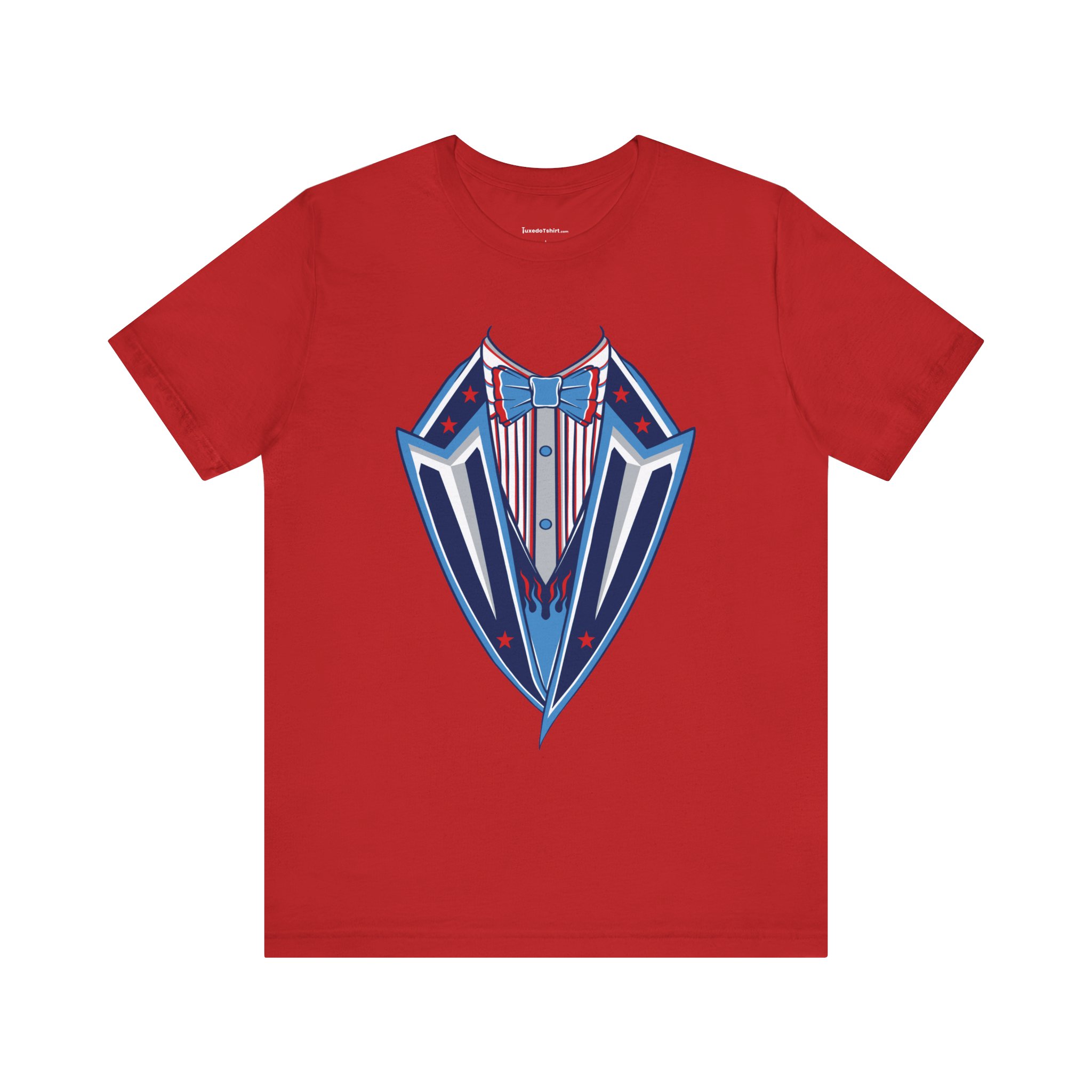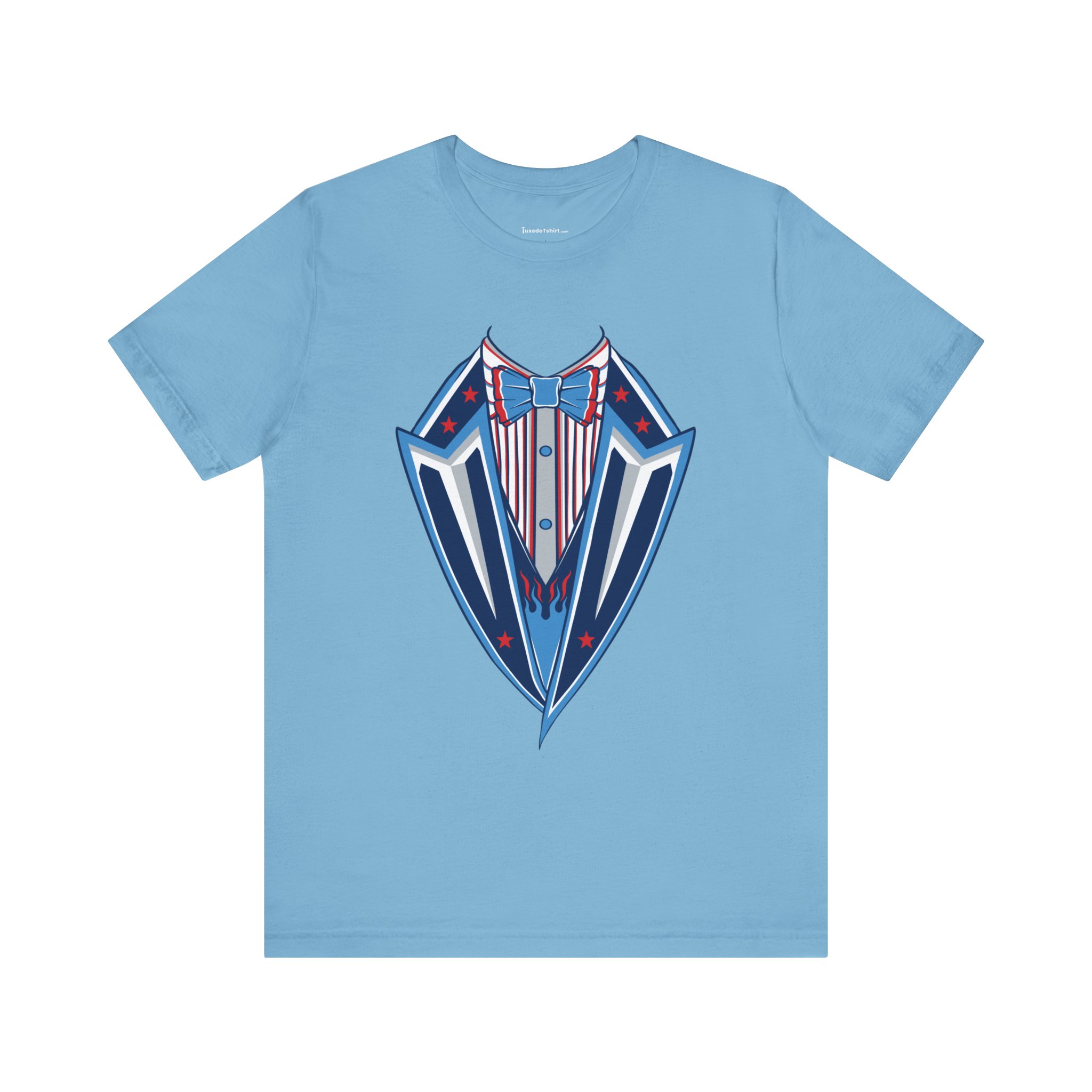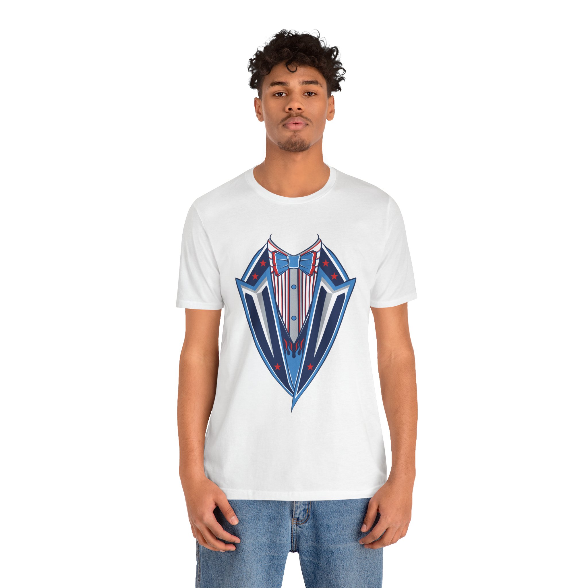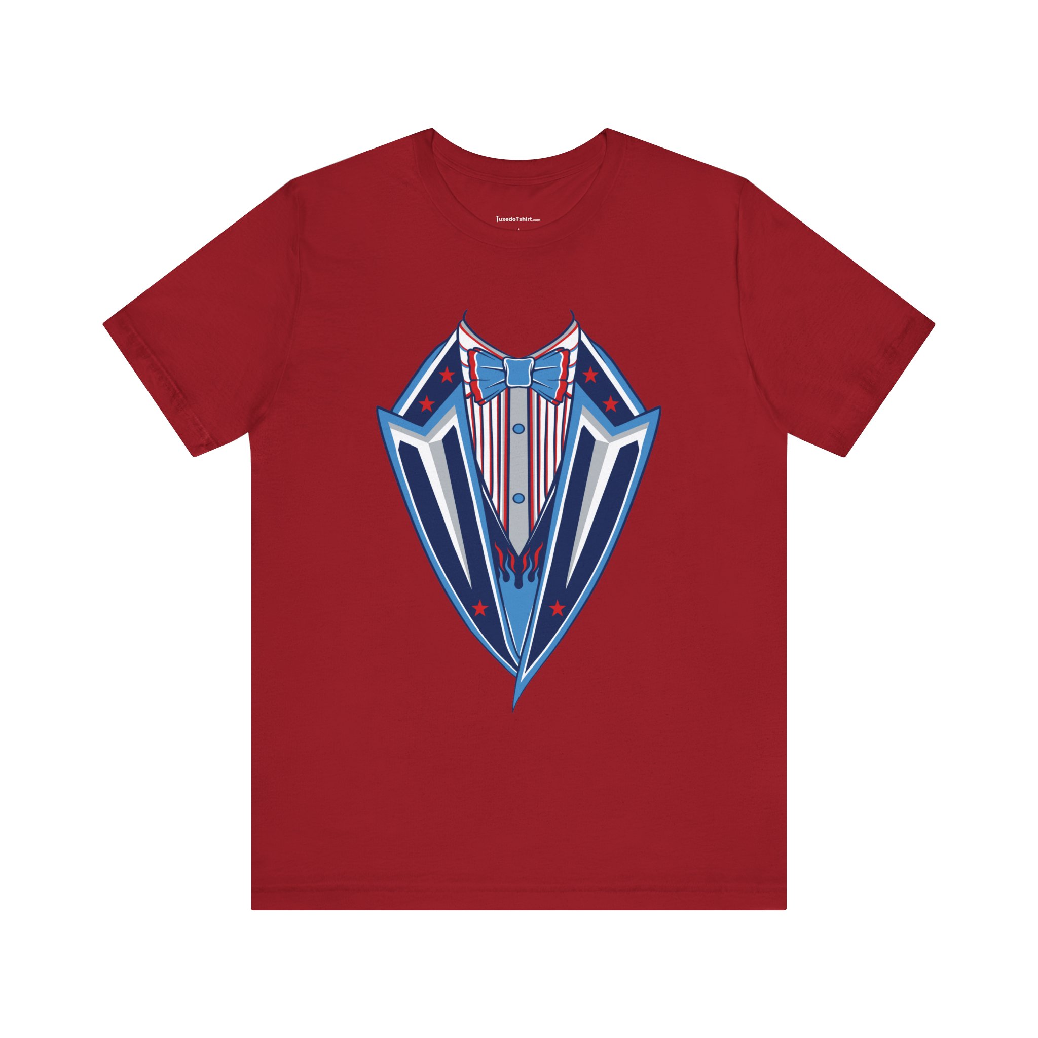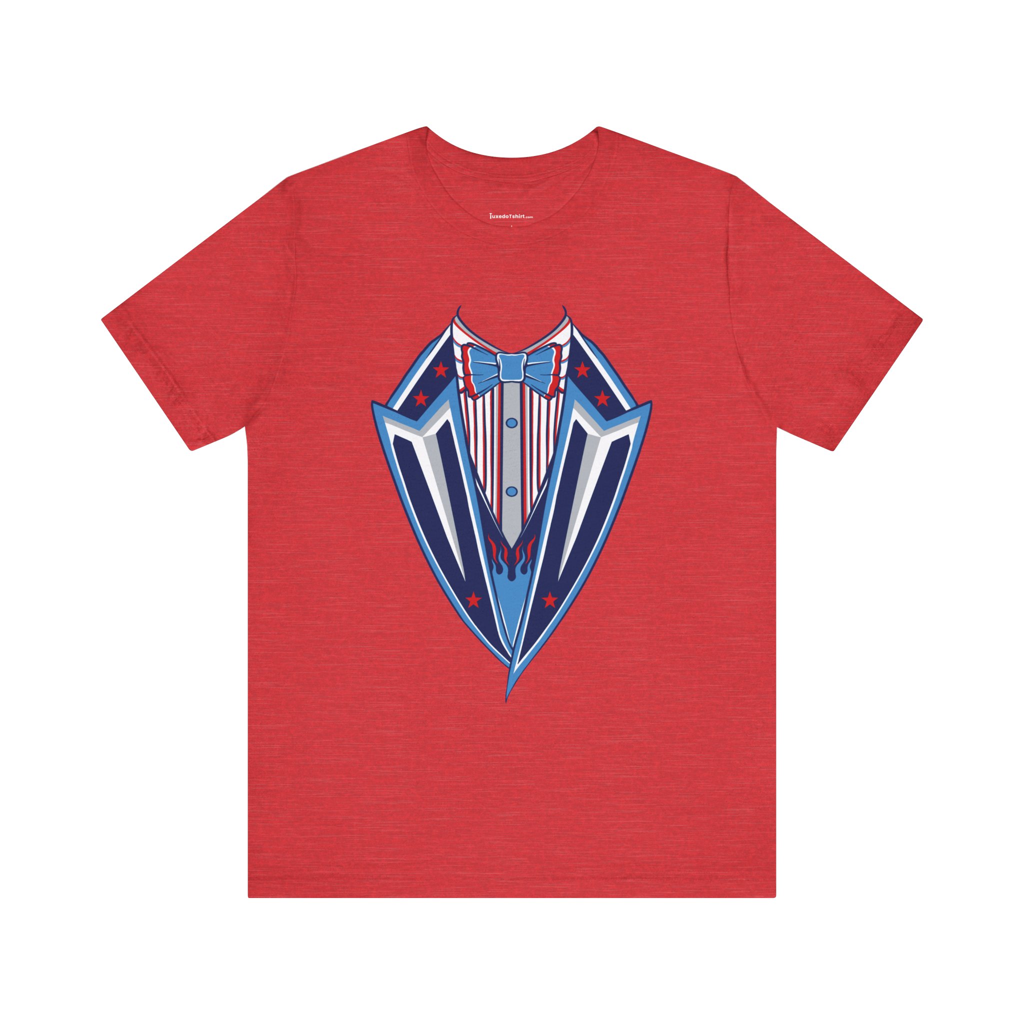 Tennessee Football Tuxedo TShirt in Navy Blue & Titans Blue. Show your Tennessee football pride with this Music City-inspired novelty tuxedo tee! Perfect for game day in Nashville, tailgating, or representing TN football spirit. Features deep Navy Blue lapels with vibrant Titans Blue trim [perhaps with a subtle, abstract flame-like shaping in the trim?], a striking Red bowtie, and a crisp white shirt front with subtle silver accents. Great fan gear for any dedicated Tennessee football supporter. Available on Navy Blue, Titans Blue, White, or Red t-shirts.