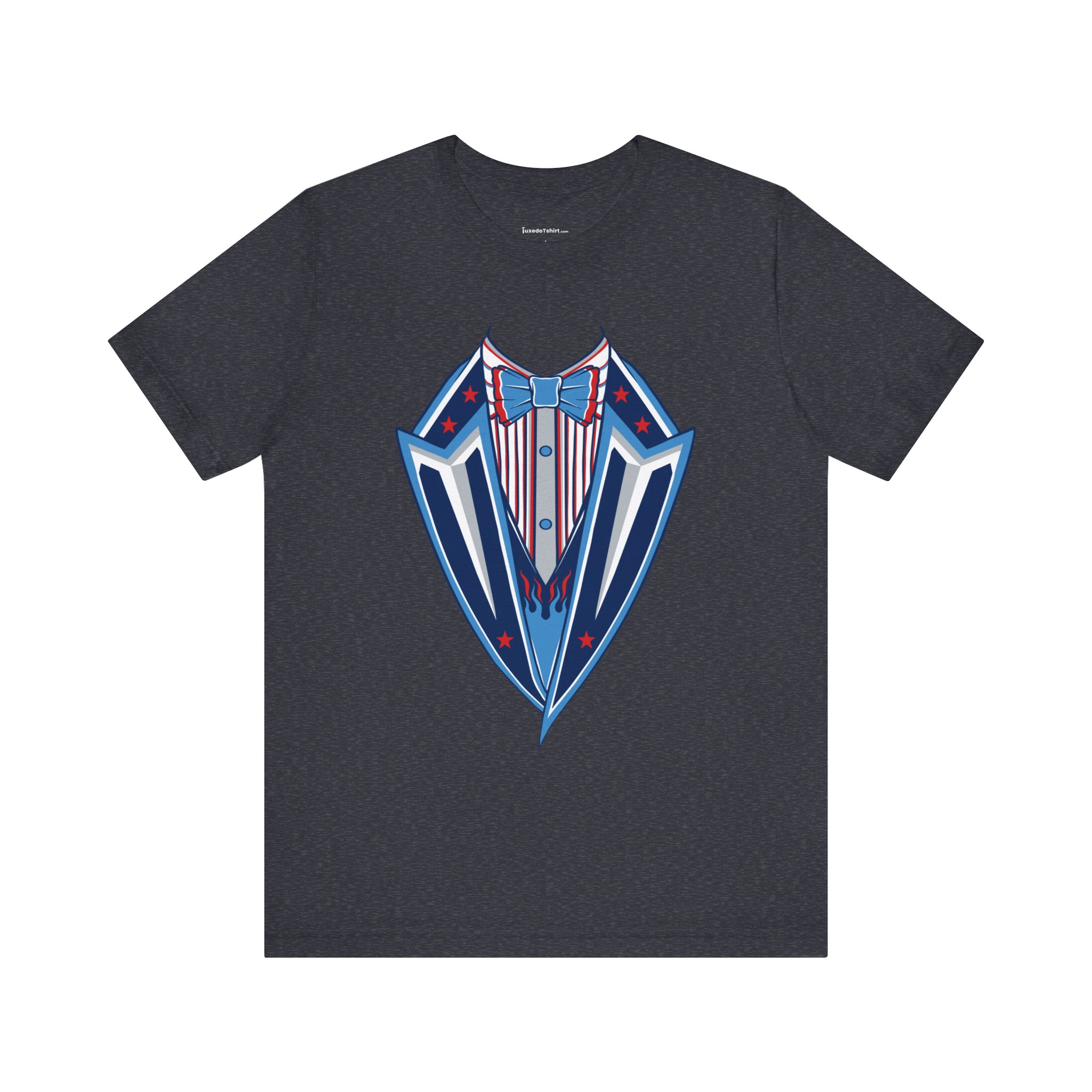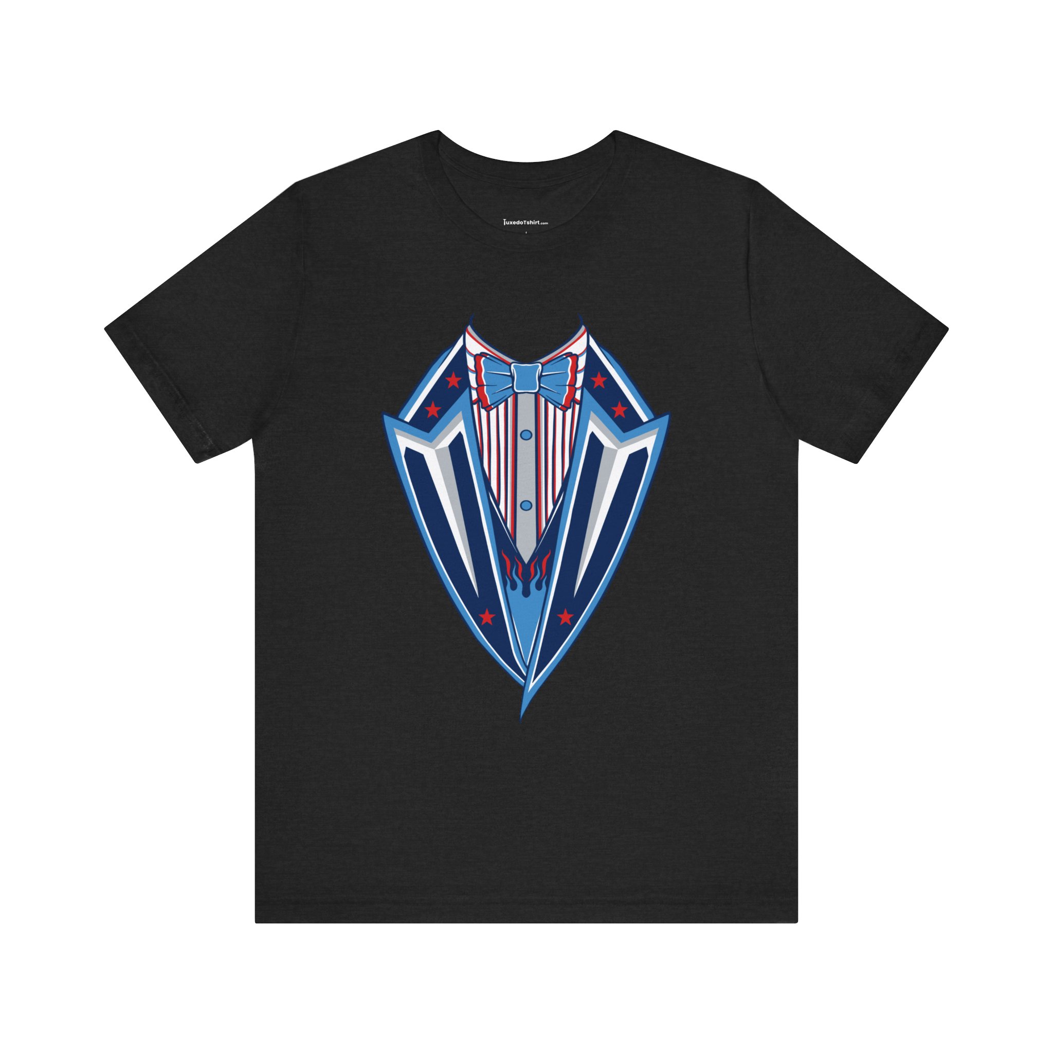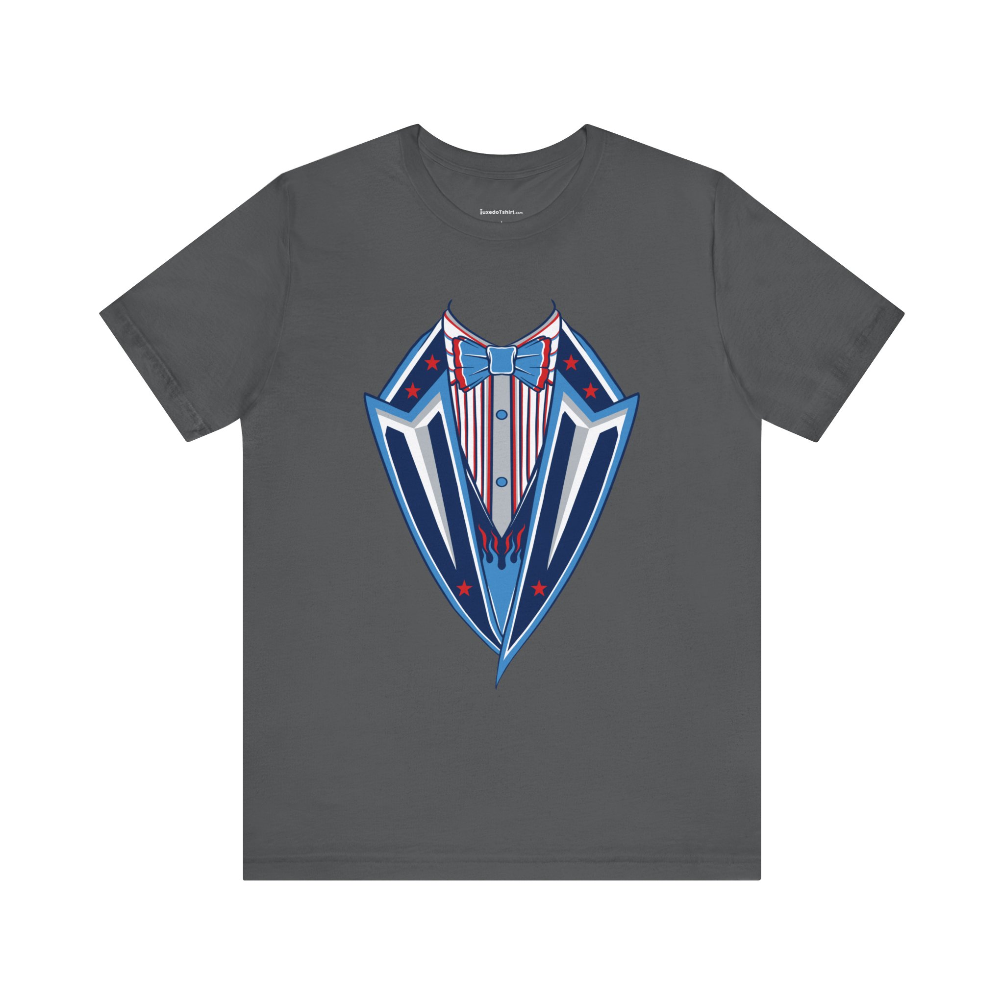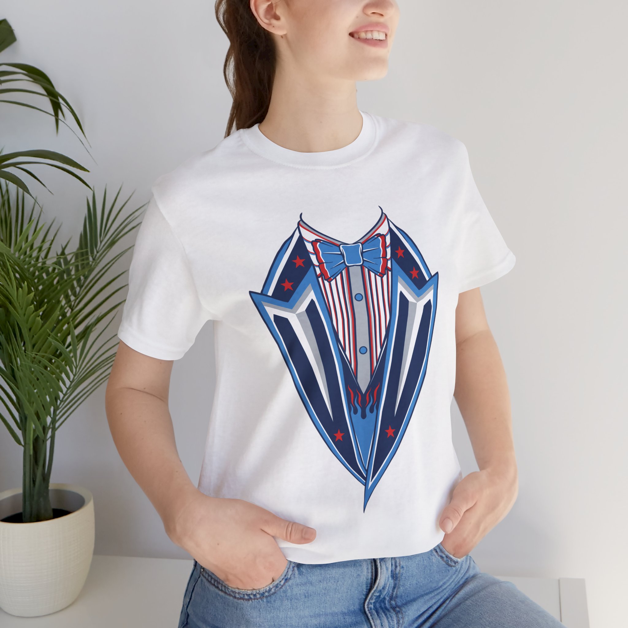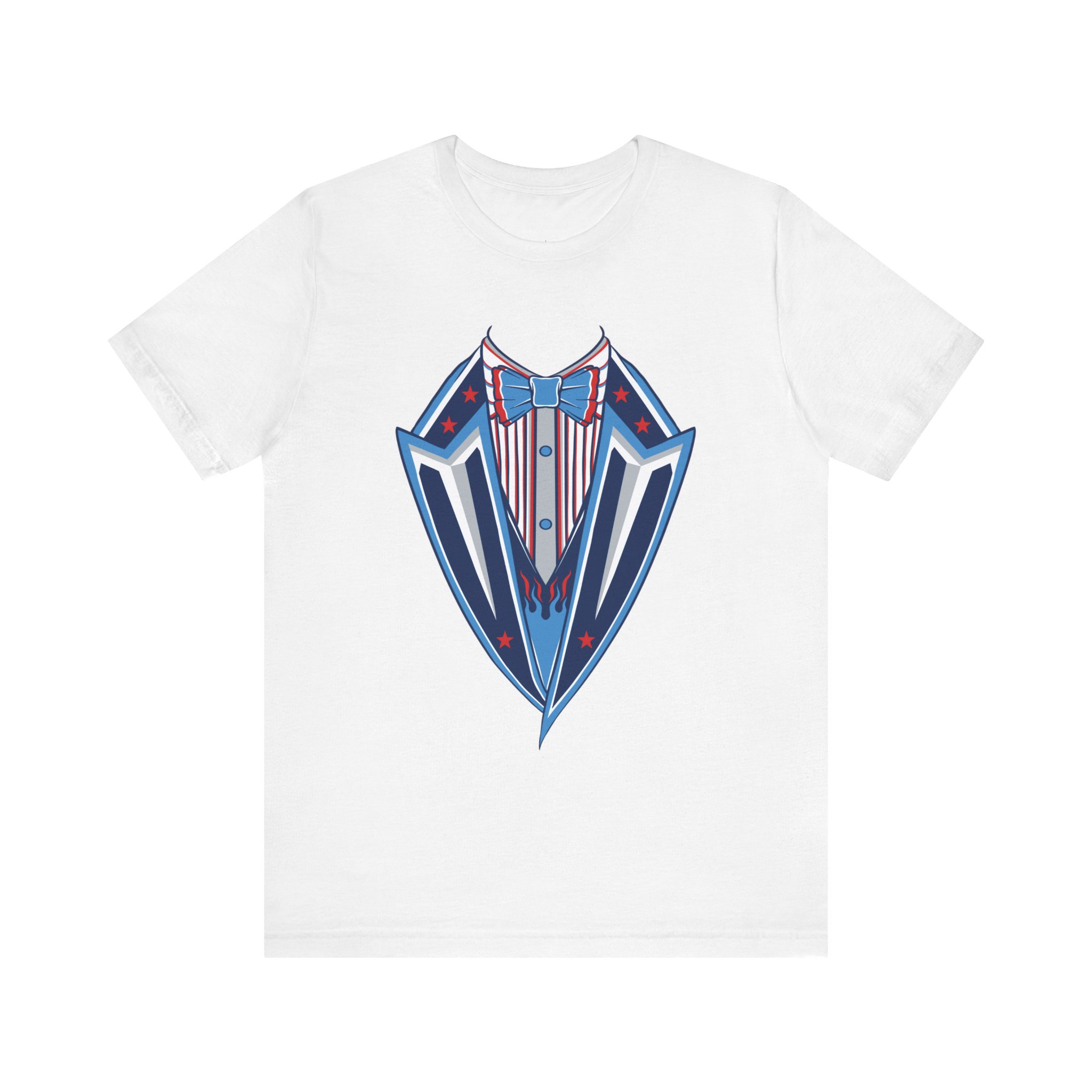 Tennessee Football Tuxedo TShirt in Navy Blue & Titans Blue. Show your Tennessee football pride with this Music City-inspired novelty tuxedo tee! Perfect for game day in Nashville, tailgating, or representing TN football spirit. Features deep Navy Blue lapels with vibrant Titans Blue trim [perhaps with a subtle, abstract flame-like shaping in the trim?], a striking Red bowtie, and a crisp white shirt front with subtle silver accents. Great fan gear for any dedicated Tennessee football supporter. Available on Navy Blue, Titans Blue, White, or Red t-shirts.
